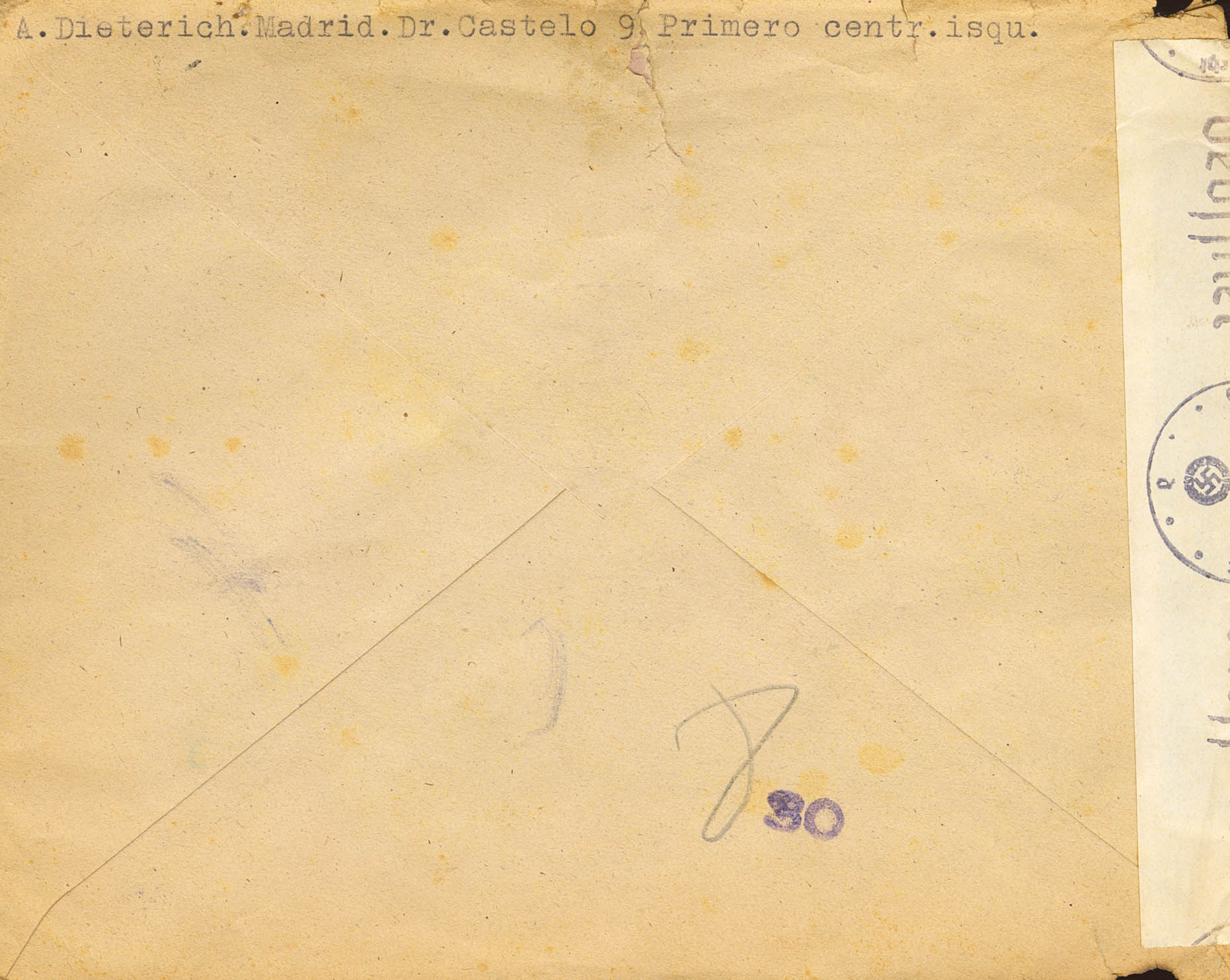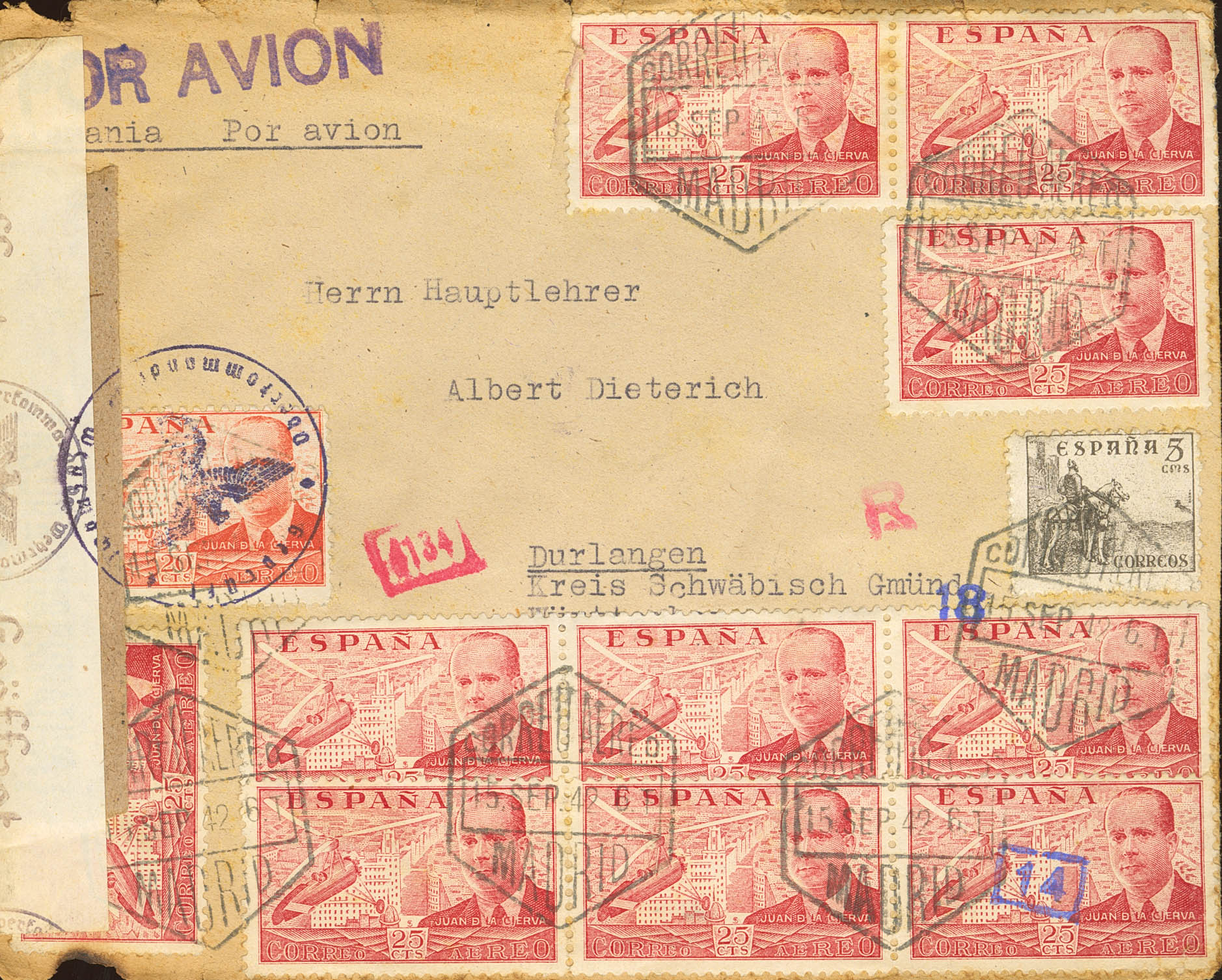 941(10). 1942. 25 cts carmín, dos tiras de tres, una pareja y dos sellos. Correo Aéreo de MADRID a DURLANGEN (ALEMANIA). En el frente diversas marcas de control del correo alemán. MAGNIFICA Y ESPECTACULAR FRANQUEO.