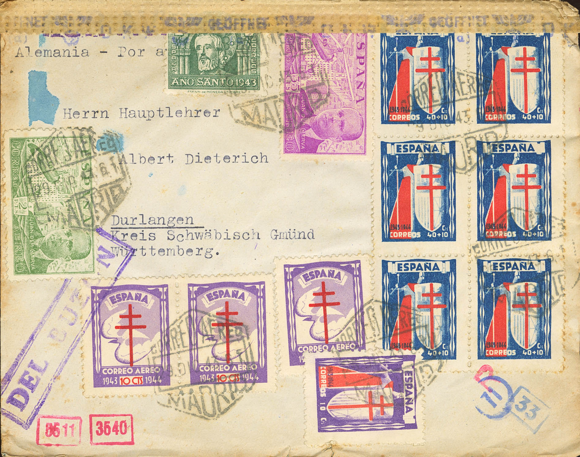 973(3), 970, 972(6). 1943. 40 cts sobre 10 cts verde, bloque de seis y 10 cts violeta, pareja y dos sellos (tres de ellos de correo aéreo). Correo Aéreo de MADRID a DURLANGEN (ALEMANIA). En el frente diversas marcas de control del correo alemán. MAGNIFICA Y ESPECTACULAR FRANQUEO CON SELLOS DE PROTUBERCULOSOS.