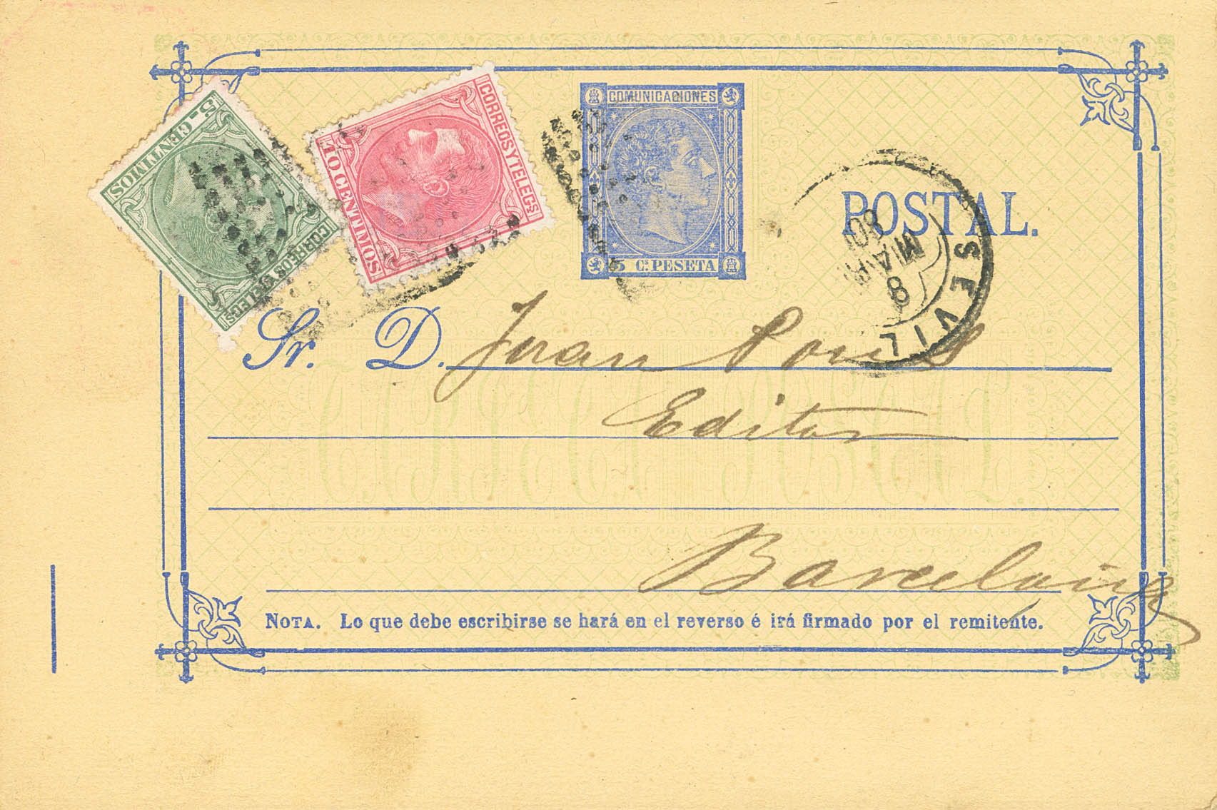 EP8. 1880. 5 cts sobre Tarjeta Entero Postal de SEVILLA a BARCELONA, con franqueo complementario de 5 cts y 10 cts. MAGNIFICA.