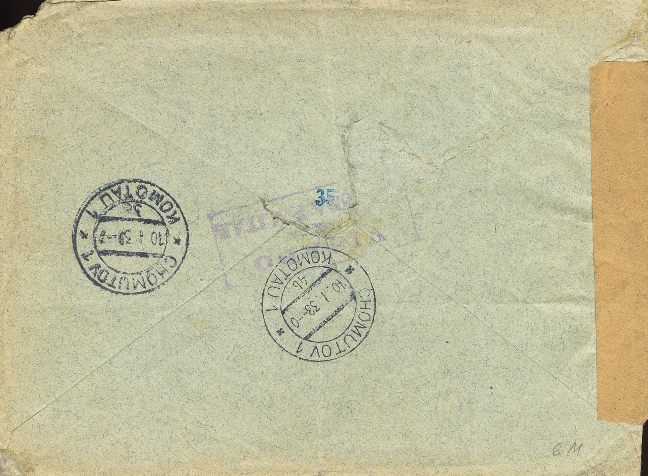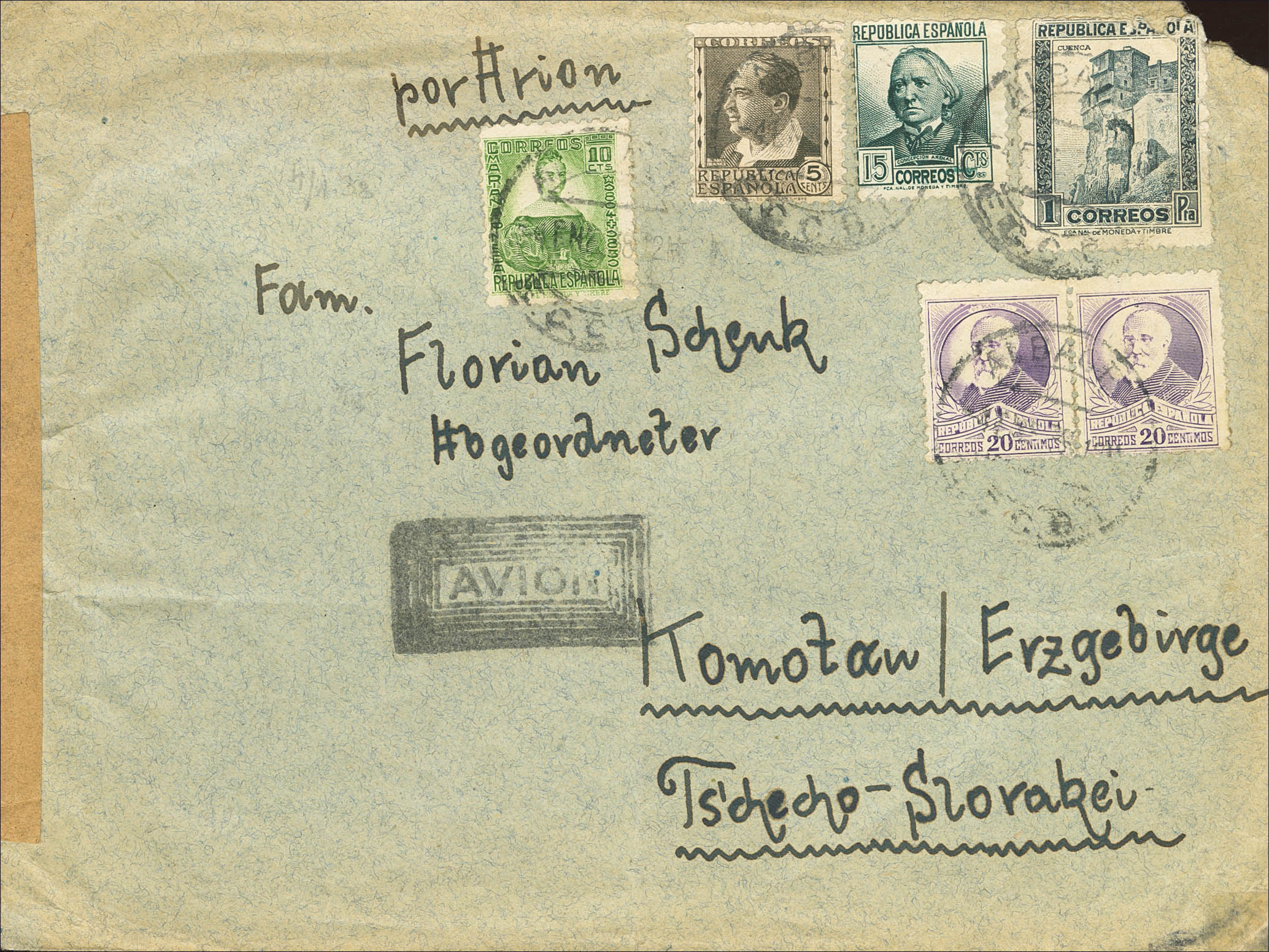 681,682,683,666(2),673. 1938. 5 cts, 10 cts, 15 cts, 20 cts, dos sellos y 1 pts pizarra (defecto). Brigadas Internacionales de ALBACETE a KOMOTAU (CHECOSLOVAQUIA). Matasello ALBACETE / E.C.C. B.I. y en el frente marca AVION, en negro y al dorso llegada. MAGNIFICA Y RARO MATASELLO.