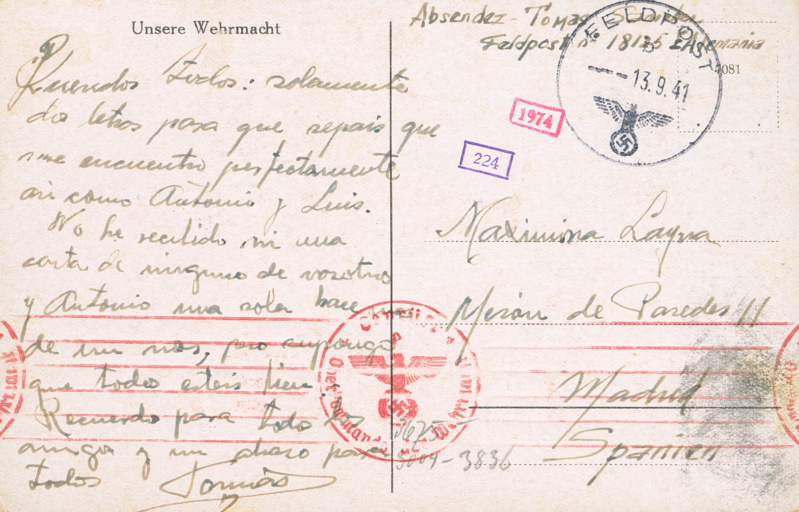 1941. Tarjeta Postal alemana (Unsere Wehrmacht). FELDPOST 18125E (Regimiento 269, 4ª Compañía ametralladoras) a MADRID. MAGNIFICA.