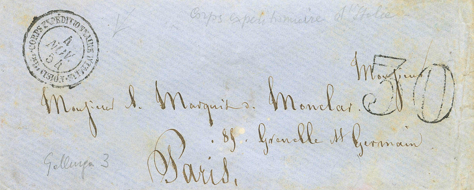 1854. Dirigida a PARIS. Fechador CORPS EXPEDITIONAIRE D´ITALIE / 1E DIVISION. MAGNIFICA.
