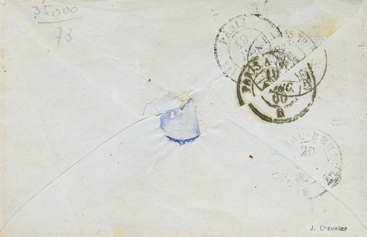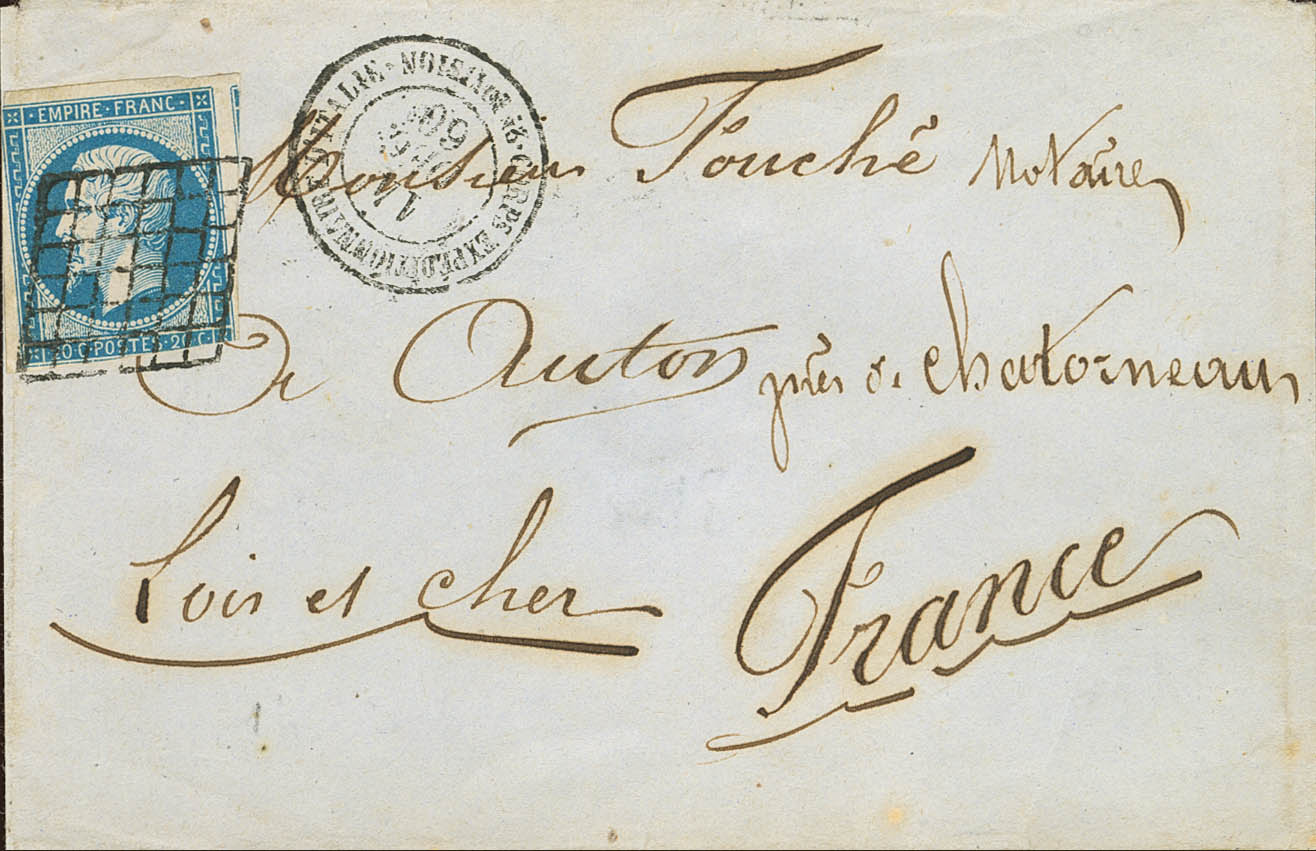 Yvert 14A. 1860. 20 cts azul (márgenes cortos). Dirigida a AUTHON. Matasello REJILLA y en el frente fechador CORPS EXPEDITIONAIRE D´ITALIE / 2E DIVISION. BONITA.