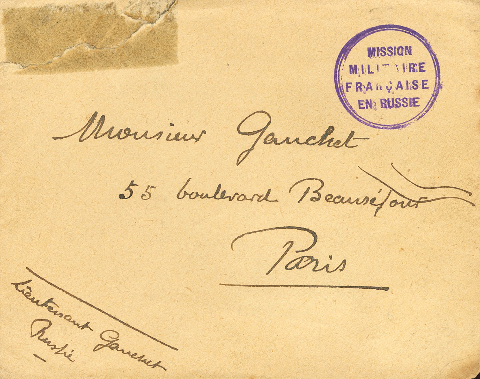 (1917ca). RUSIA a PARIS. Marca MISSION / MILITAIRE / FRANCAISE / EN RUSSIE, en violeta (en Octubre de 1917 llega a Petrogrado la misión militar francesa en Rusia, con la misión de conseguir que los Bolcheviques, tras la Revolución, no firmaran una paz separada con Alemania y los Imperios Centrales en los estertores de la I Guerra Mundial)(rotura en la esquina por apertura). BONITA Y RARISIMA.