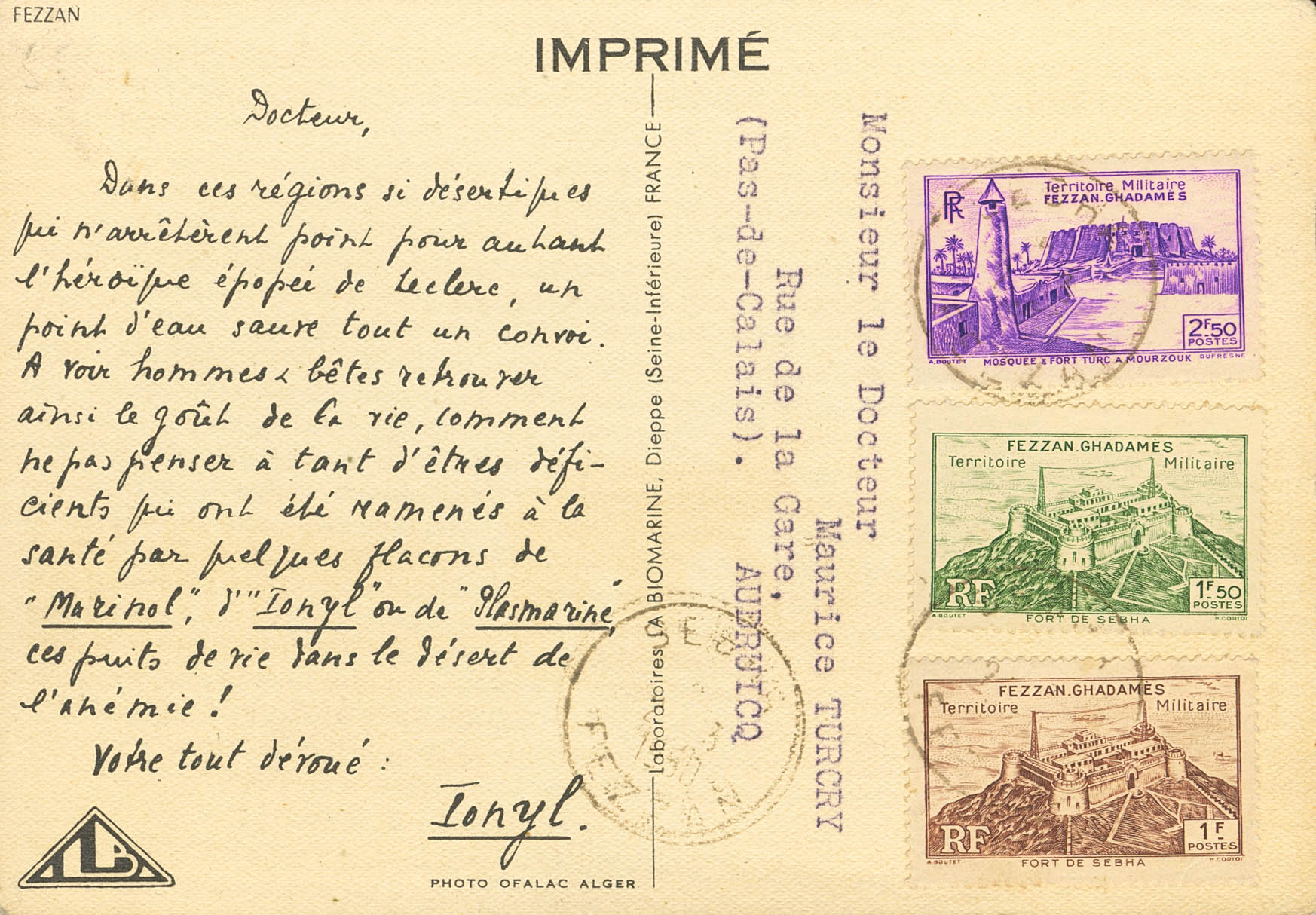 Yvert 30, 31, 33. 1950. 1 f castaño, 1´50 f verde y 2´50 f violeta. Tarjeta Postal de SEBHA a AUDRUICQ (FRANCIA). MAGNIFICA Y RARA.