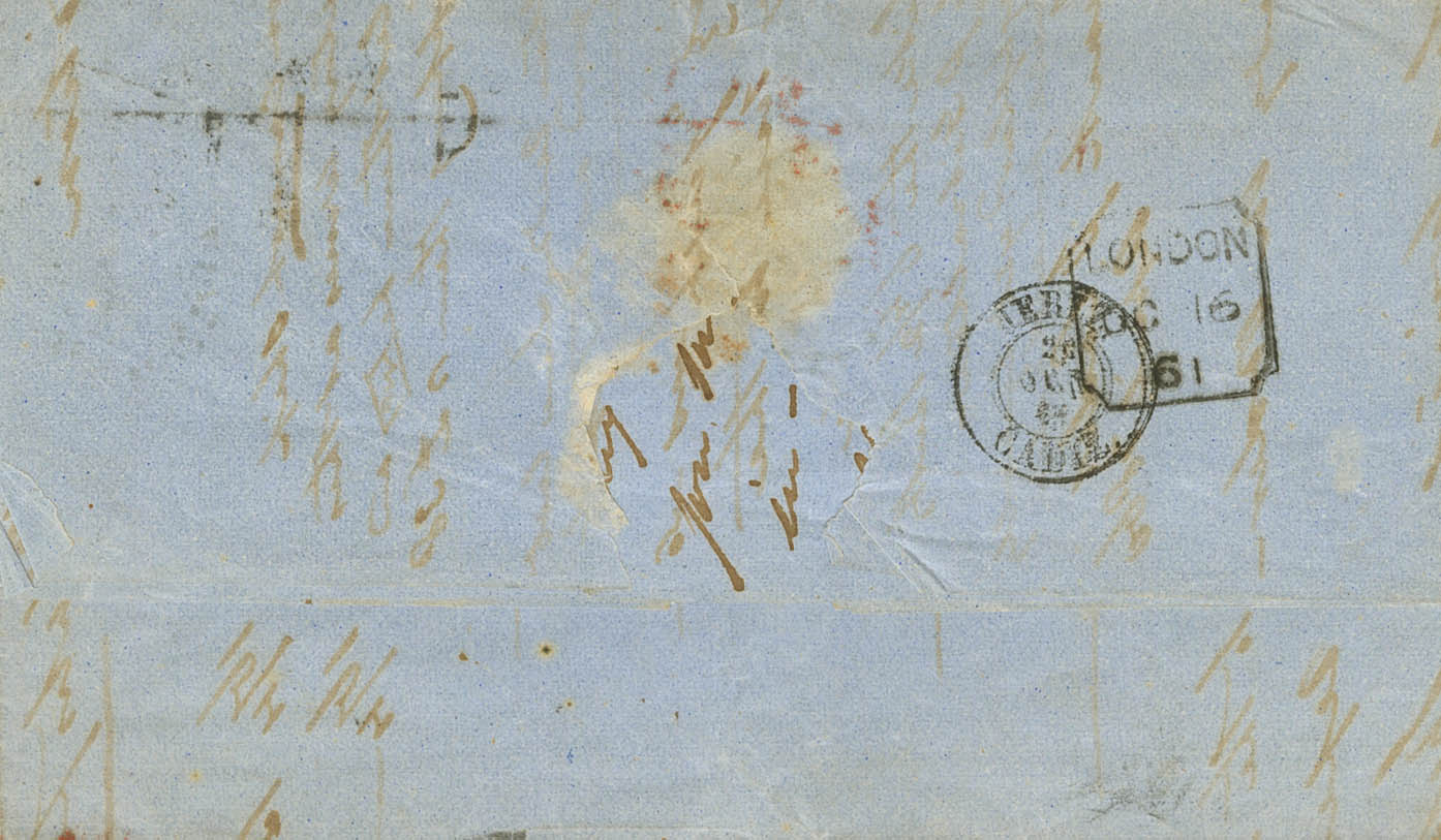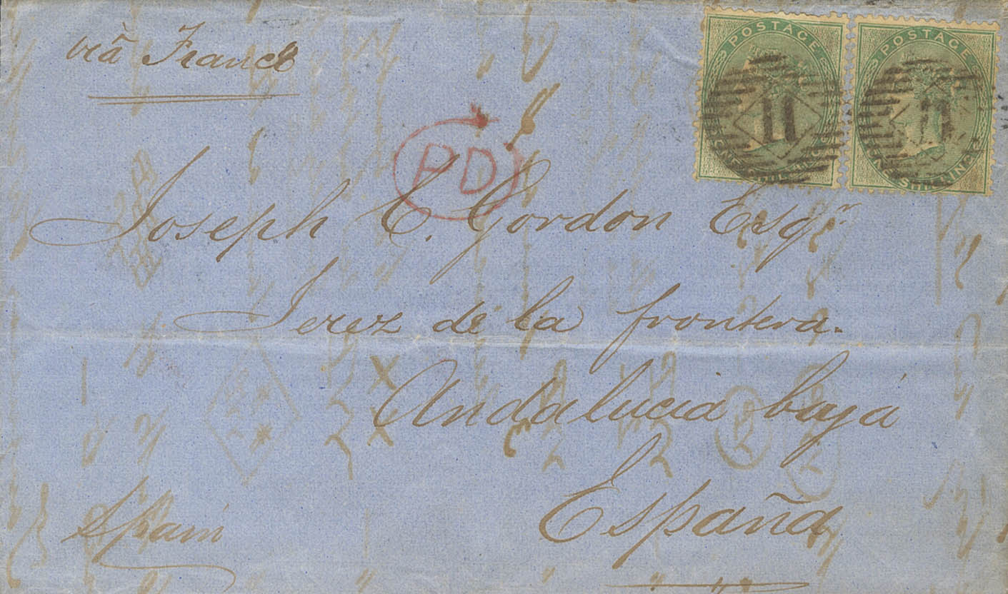 Yvert 20(2). 1861. 1 shilling verde, dos sellos. LONDRES a JEREZ DE LA FRONTERA. Matasello numeral "11". MAGNIFICA.