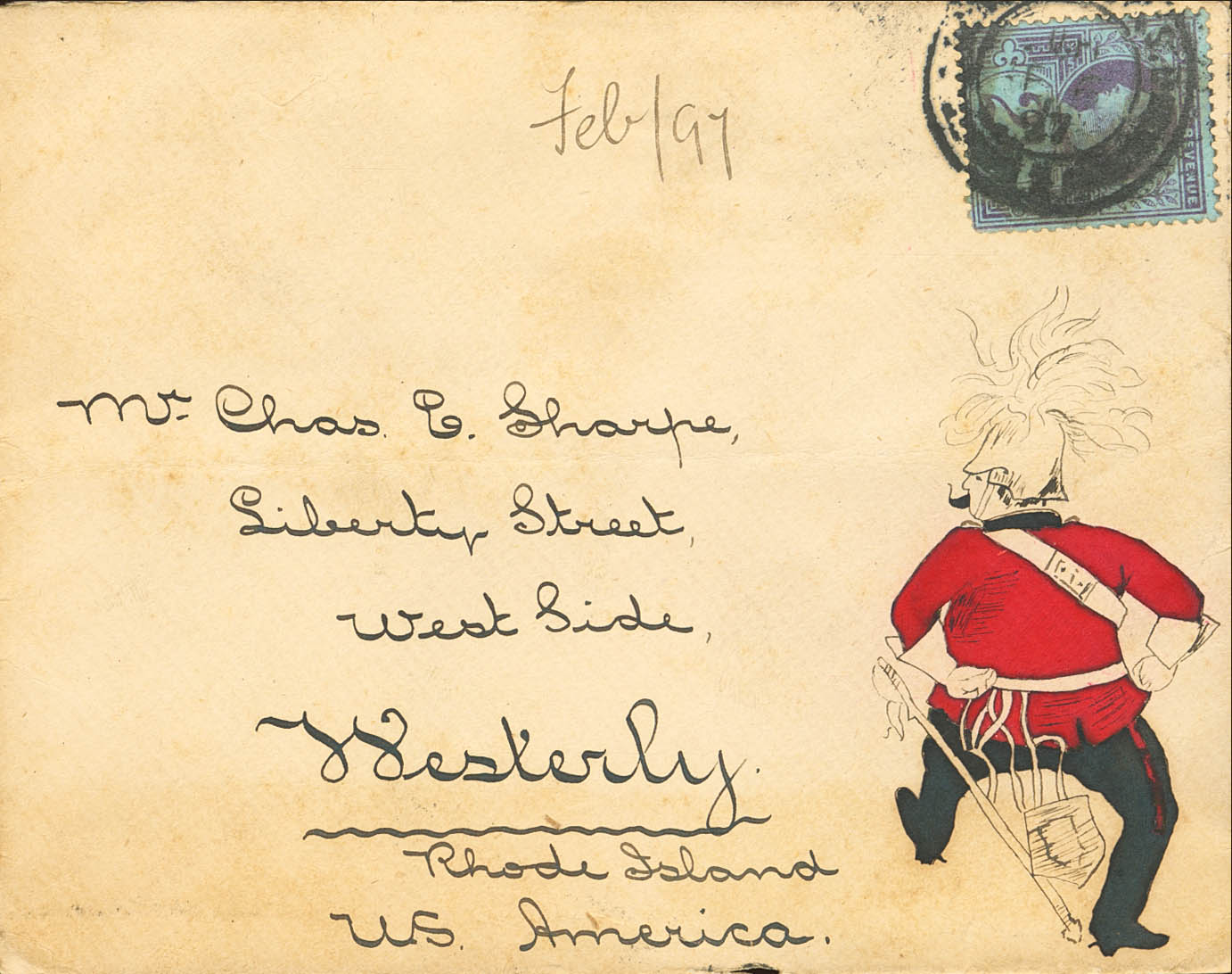 Yvert 95. 1897. 2½ p violeta sobre azul. Sobre pintado a mano (soldado) dirigido a WESTERLY (U.S.A.). Al dorso llegada. MAGNIFICA Y RARA.