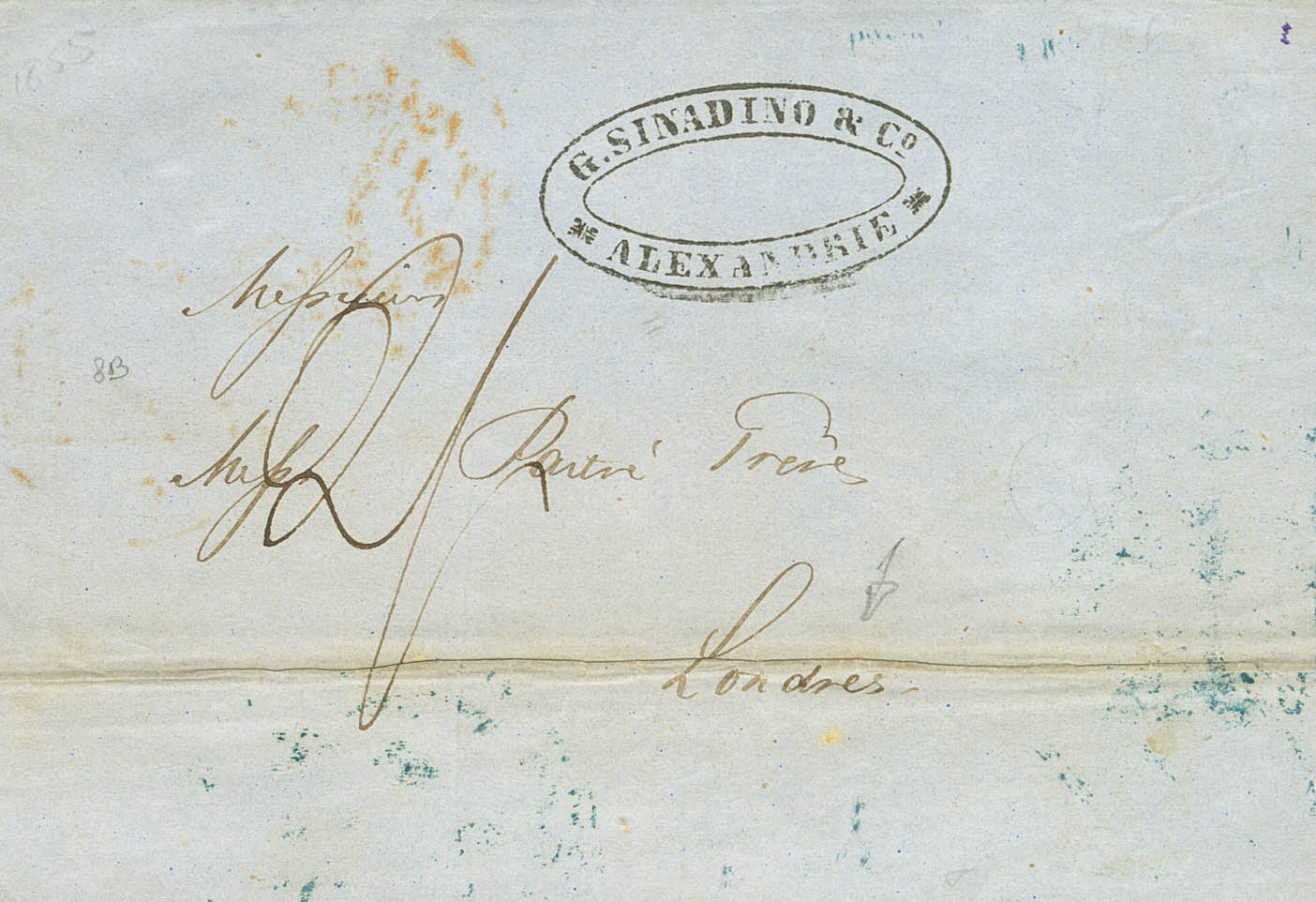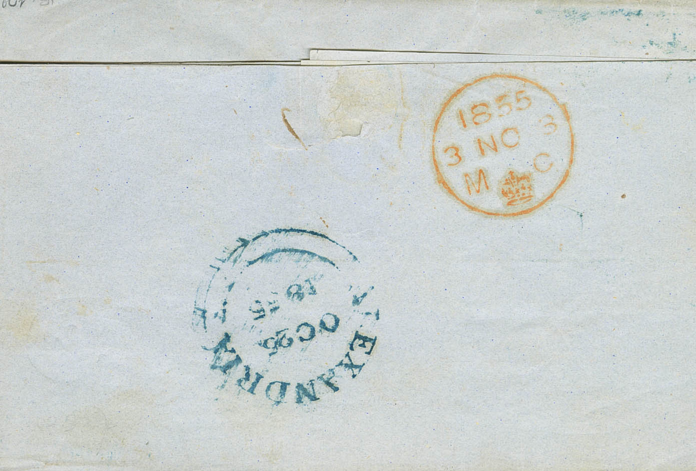 1855. ALEJANDRIA a LONDRES (GRAN BRETAÑA). Al dorso fechador doble arco ALEXANDRIA, en azul, de la Agencia Postal Británica. MAGNIFICA.