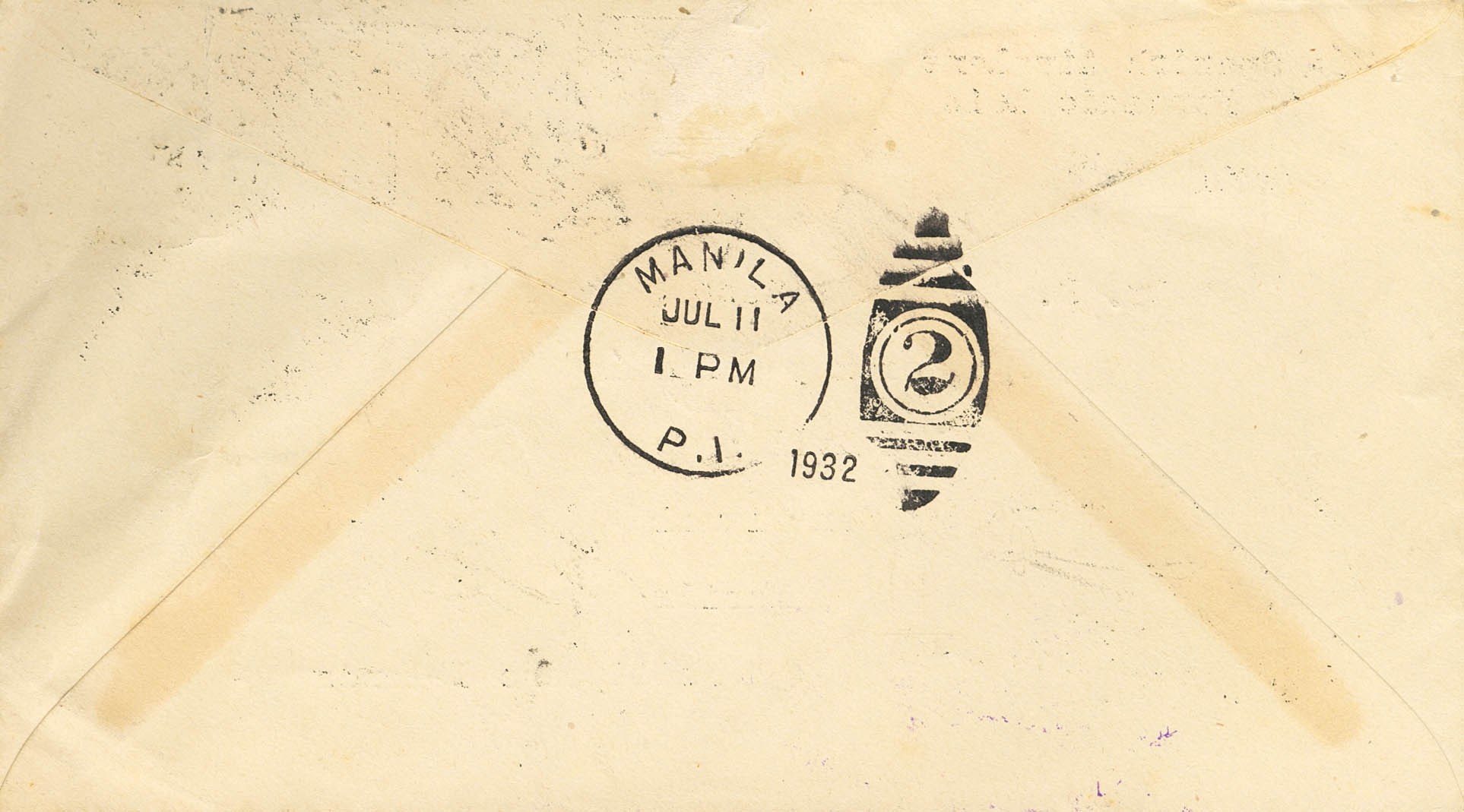 Yvert 119A, 120, 120A, 122. 1932. 3 ctvos gris, 4 ctvos rojo, 5 ctvos violeta y 8 ctvos naranja. Correo Aéreo de HONG KONG a MANILA (FILIPINAS). En el frente marca SECOND MADRID-MANILA FLIGHT / AVIATOR FERNANDO REIN / BUREAU OF POST, MANILA P.I., en violeta y firma del piloto. MAGNIFICA Y MUY RARA CON LA FIRMA DE FERNANDO REIN.