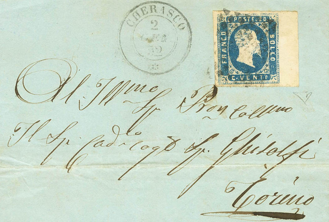 Yvert 2. 1852. 20 cts azul, borde de hoja. CHERASCO a TURIN. Matasello ROMBO DE PUNTOS y en el frente fechador CHERASCO. MAGNIFICA. Cert. DIENA. (Sassone 2)