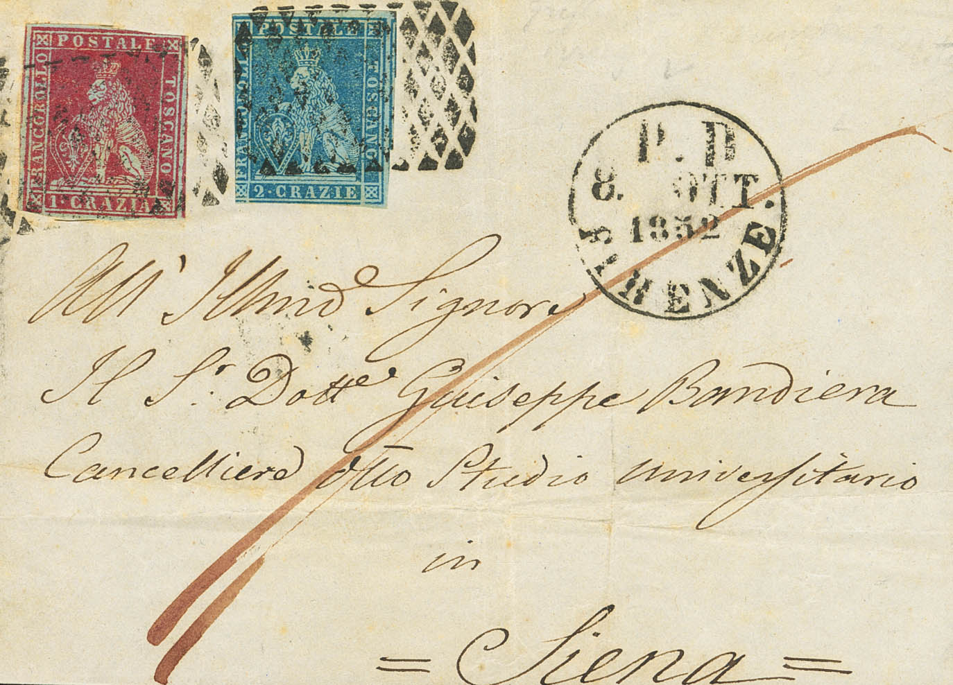 Yvert 4, 5. 1852. 1 c carmín y 2 c azul (algún margen justo). FLORENCIA a SIENA. BONITA.
