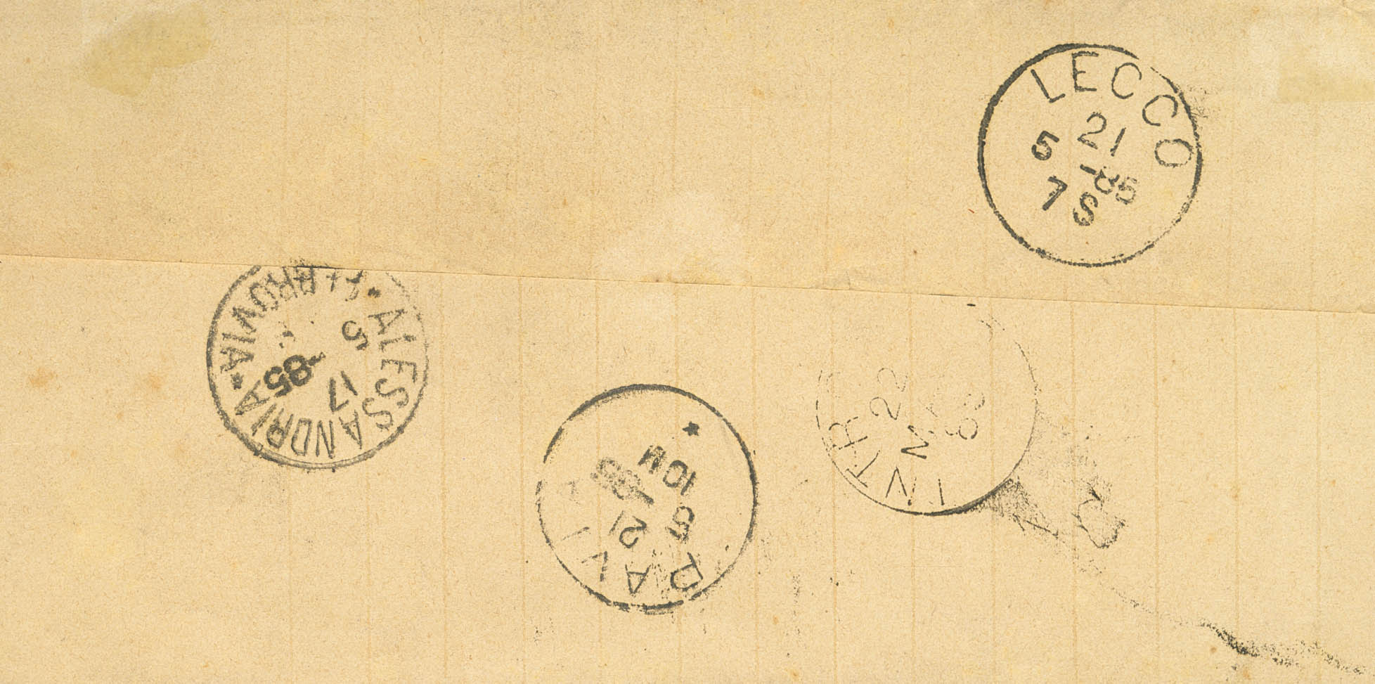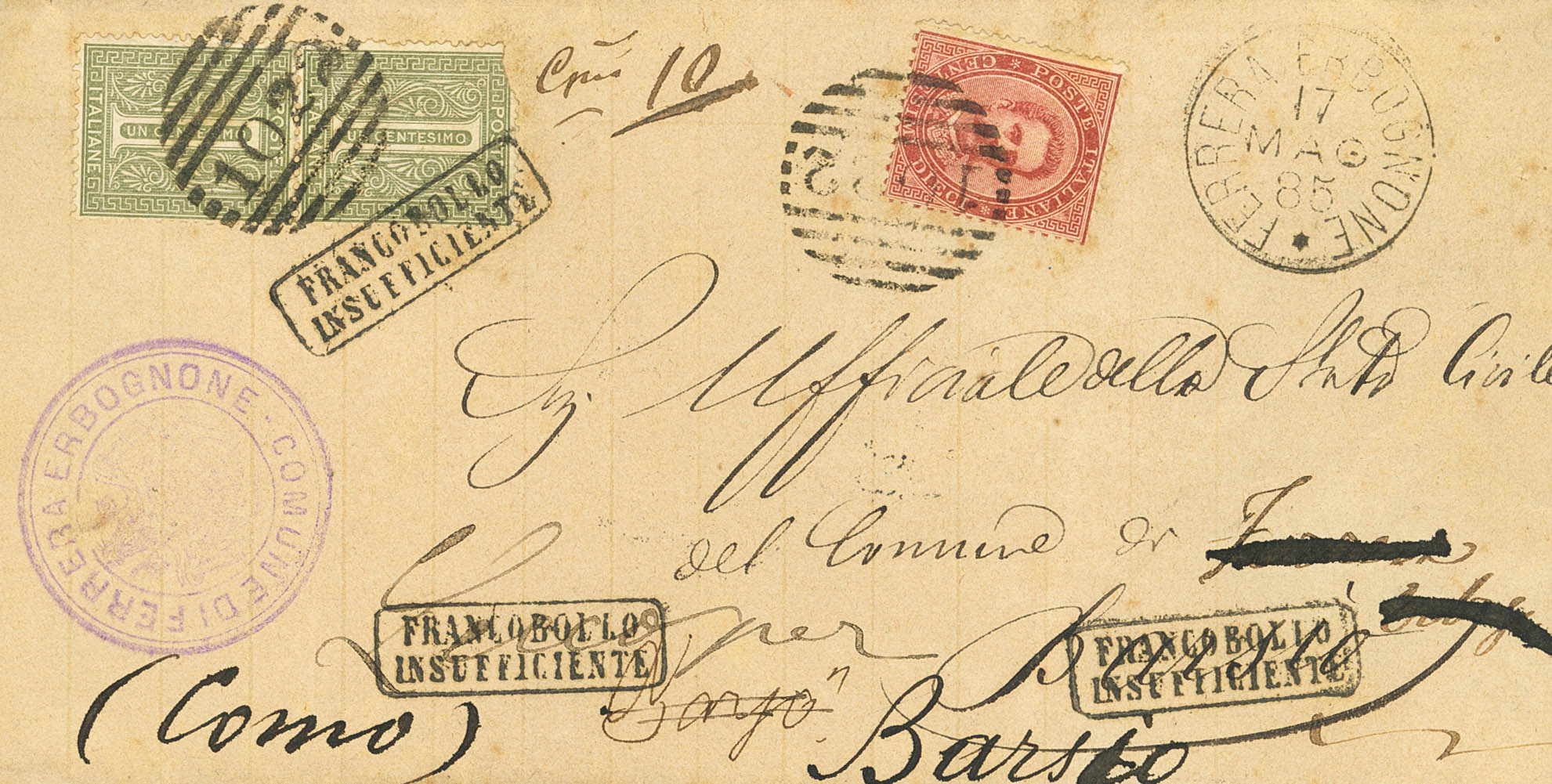 Yvert 34, 12(2). 1885. 10 cts carmín y 1 cts oliva, pareja (un sello defecto en una esquina). FERRERA ERBOGNONE a LECCO. Matasello PARRILLA CON NUMERO Nº1022 y en el frente marca FRANCOBOLLO / INSUFFICIENTE, al dorso tránsitos ALESSANDRIA, INTRA y PANIA. MAGNIFICA E INUSUAL. (Sassone 38, T14)