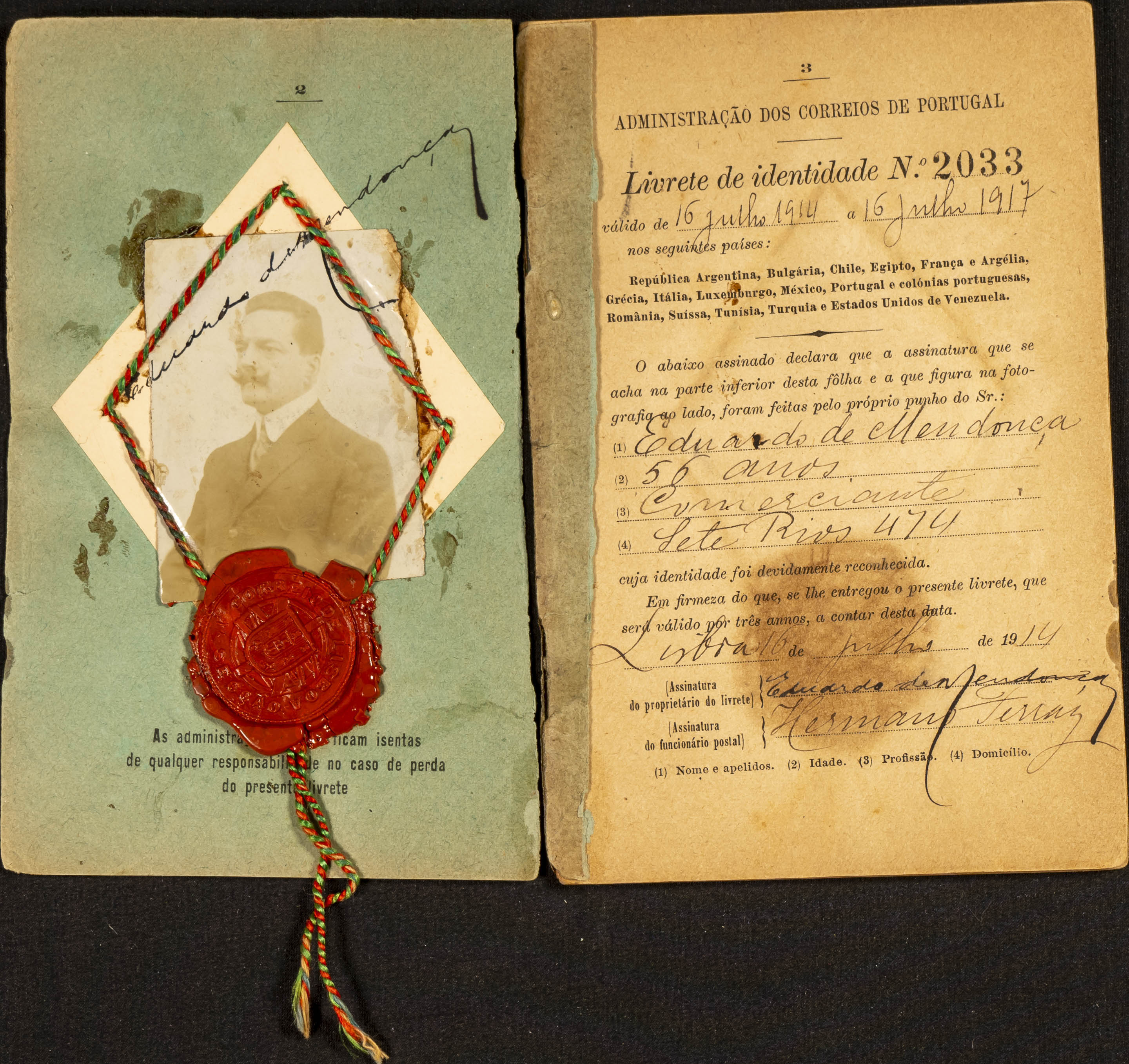 1914. LIVRETE DE IDENTIDADE de la Unión Postal Universal emitido por la Administración de Correos de Portugal (portada desprendida). BONITO.