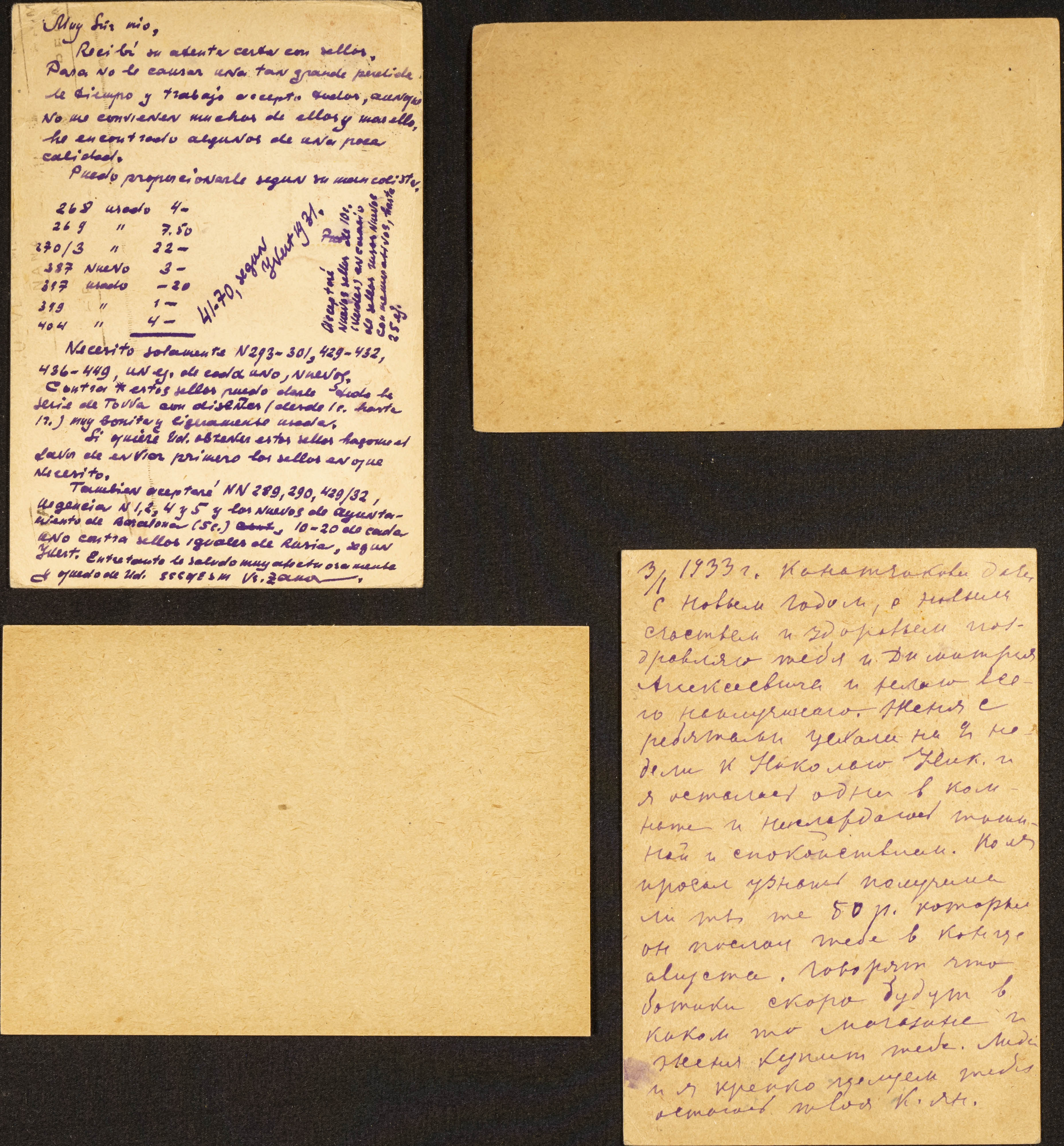 (1932ca). Cuatro Tarjetas Entero Postales, dos con ilustraciones de dirigibles (una del Kliment Voroschilov y otra circulada), una con propaganda para el envío de correspondencia (circulada) y otra con propaganda de la lucha aérea contra las plagas del campo. MAGNIFICAS Y RARAS.