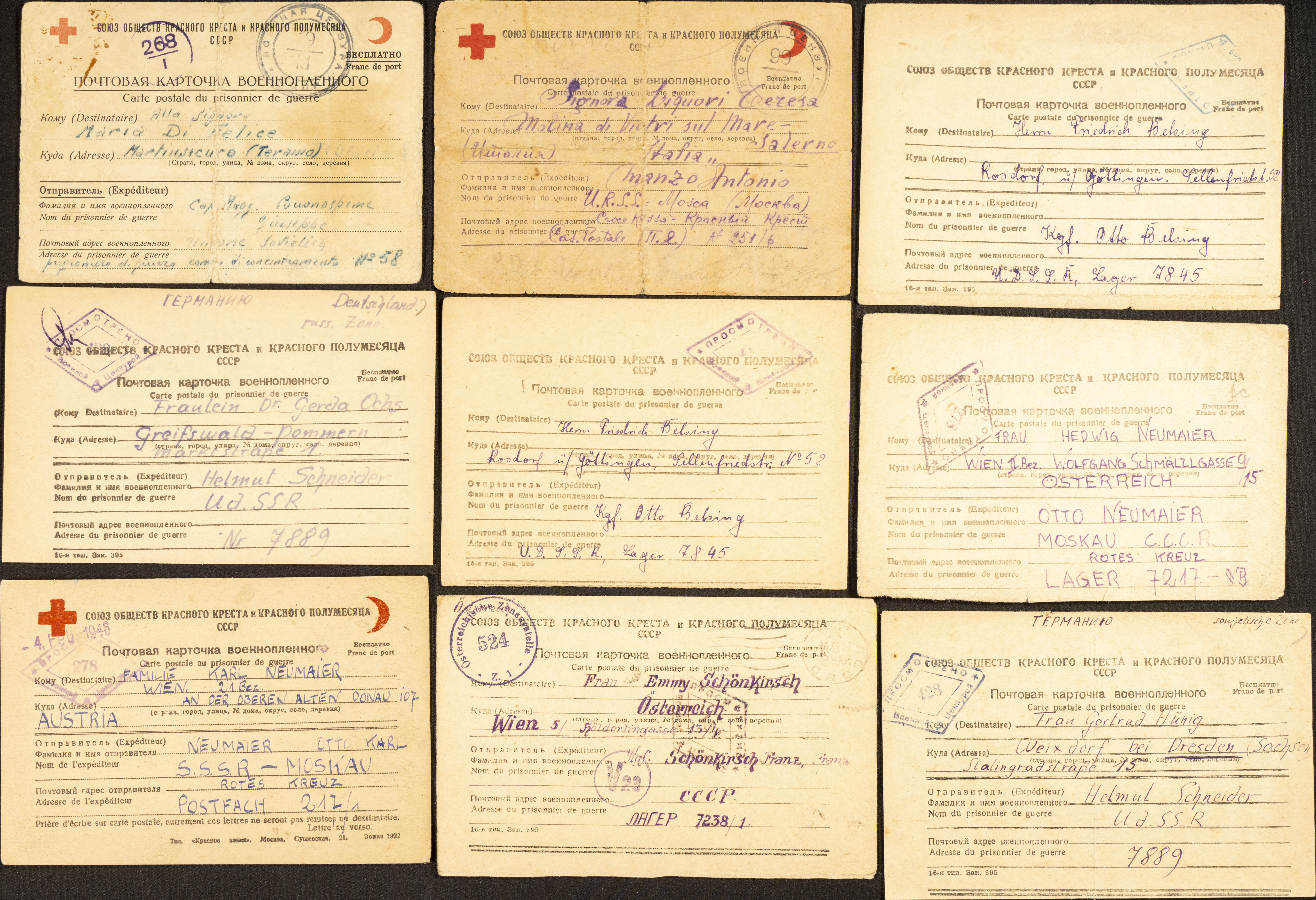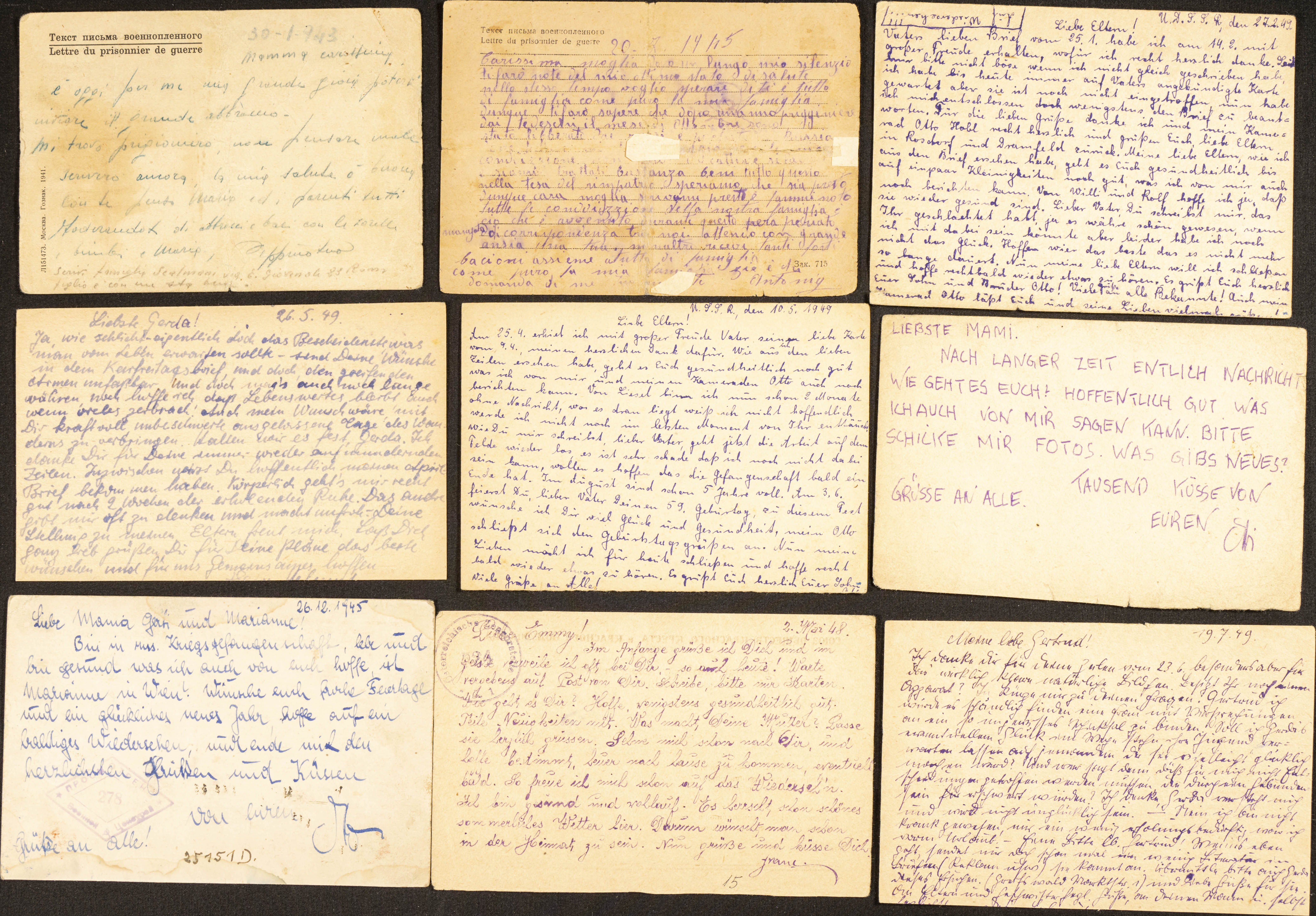 (1949ca). Conjunto de nueve tarjetas de Prisioneros de Guerra en Rusia, enviadas por italianos (una fechada en 1943 informando a la familia de su captura), alemanes y austriacos internados en campos de concentración o prisioneros rusos después de la II Guerra Mundial. MAGNIFICO Y RARO CONJUNTO.