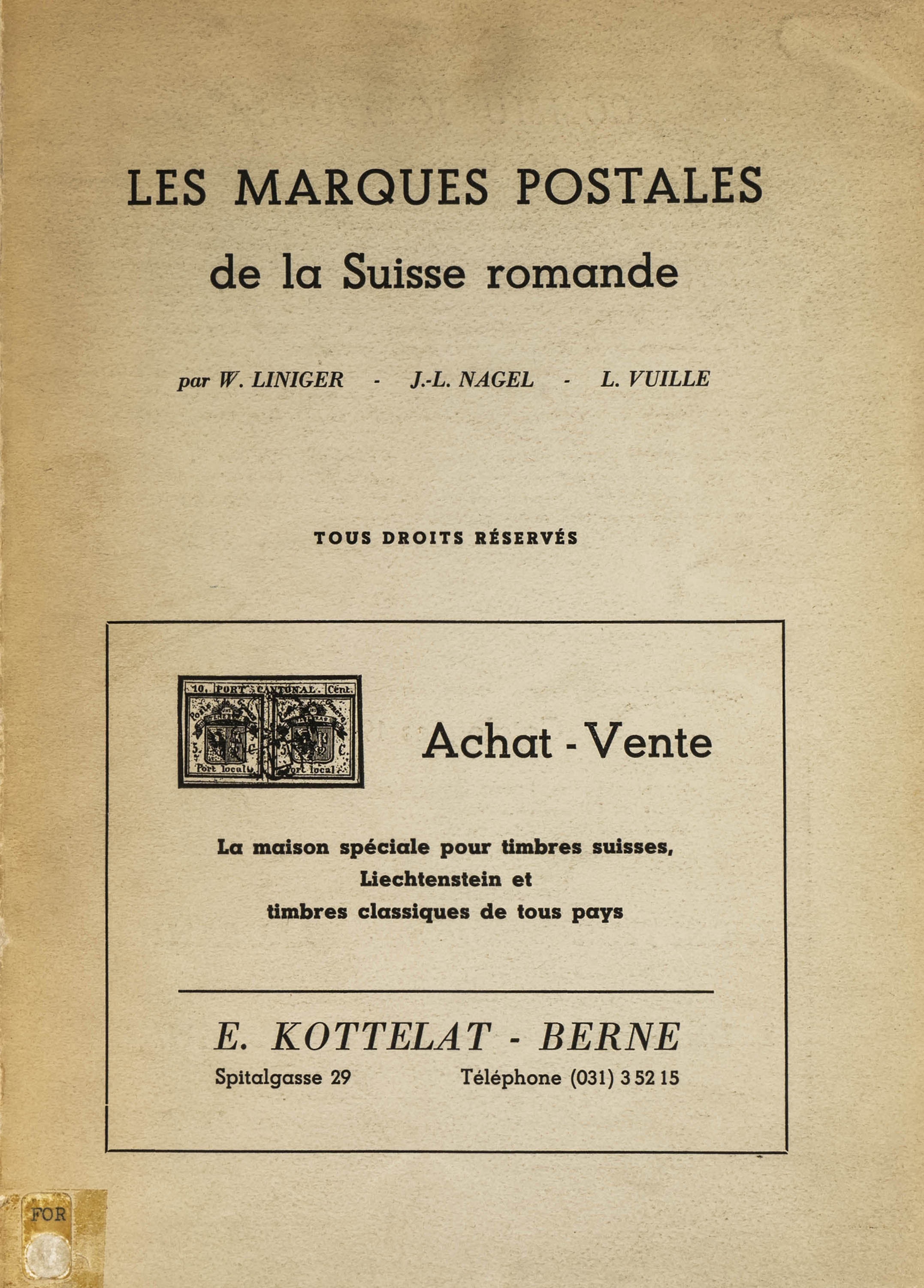1955. LES MARQUES POSTALES DE LA SUISSE ROMANDE. W.Liniger, J.L.Nagel y L.Vville, 1955 (parte inferior del lomo abierto).