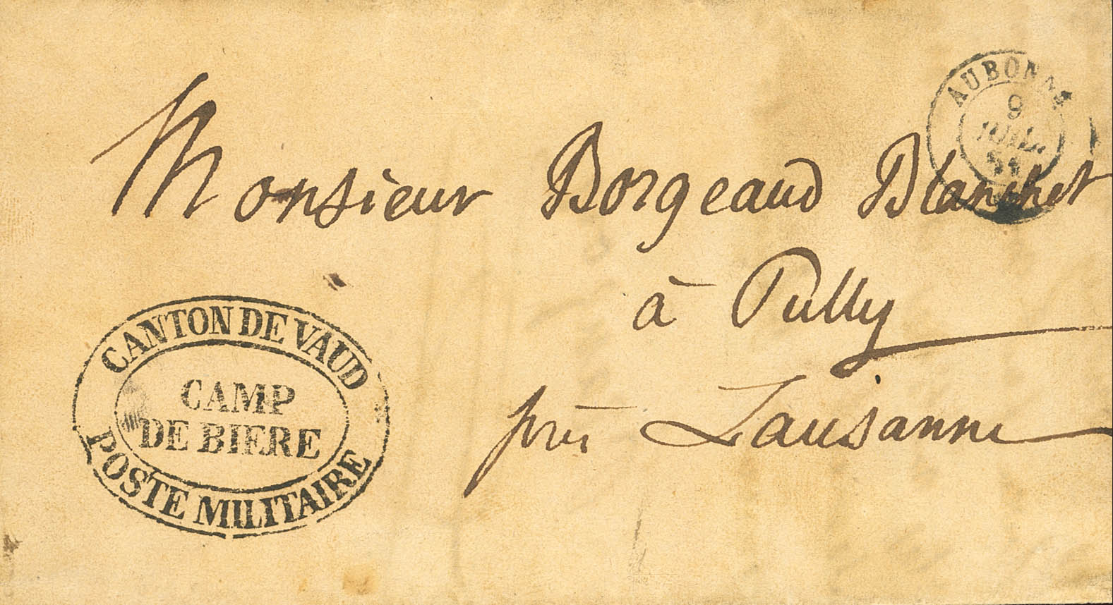 1851. AUBONNE a PULLY. Marca de franquicia CANTON DE VAUD / CAMP / DE BIERE / POSTE MILITAIRE. MAGNIFICA.