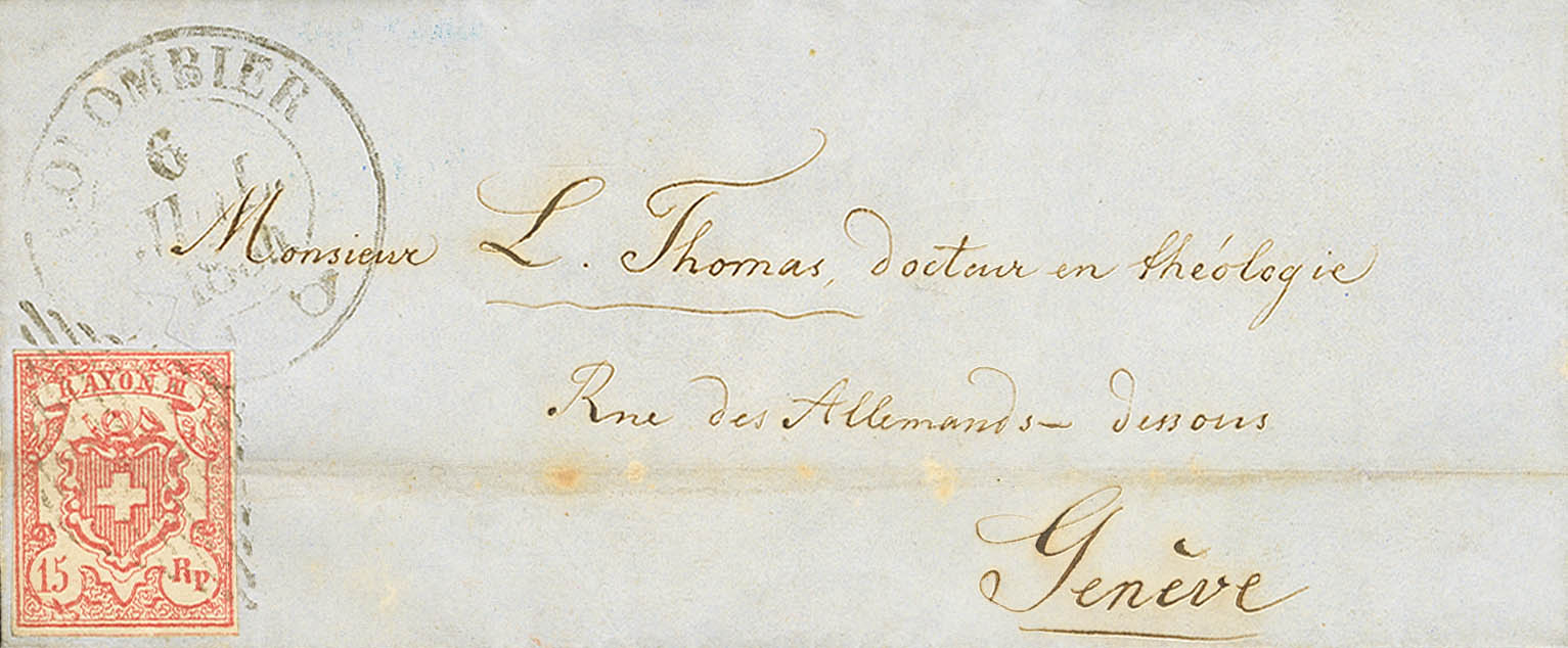Yvert 23. 1954. 15 r rojo (Tipo II). AREUSE a GINEBRA. Matasello REJILLA y fechador COLOMBIER. MAGNIFICA.