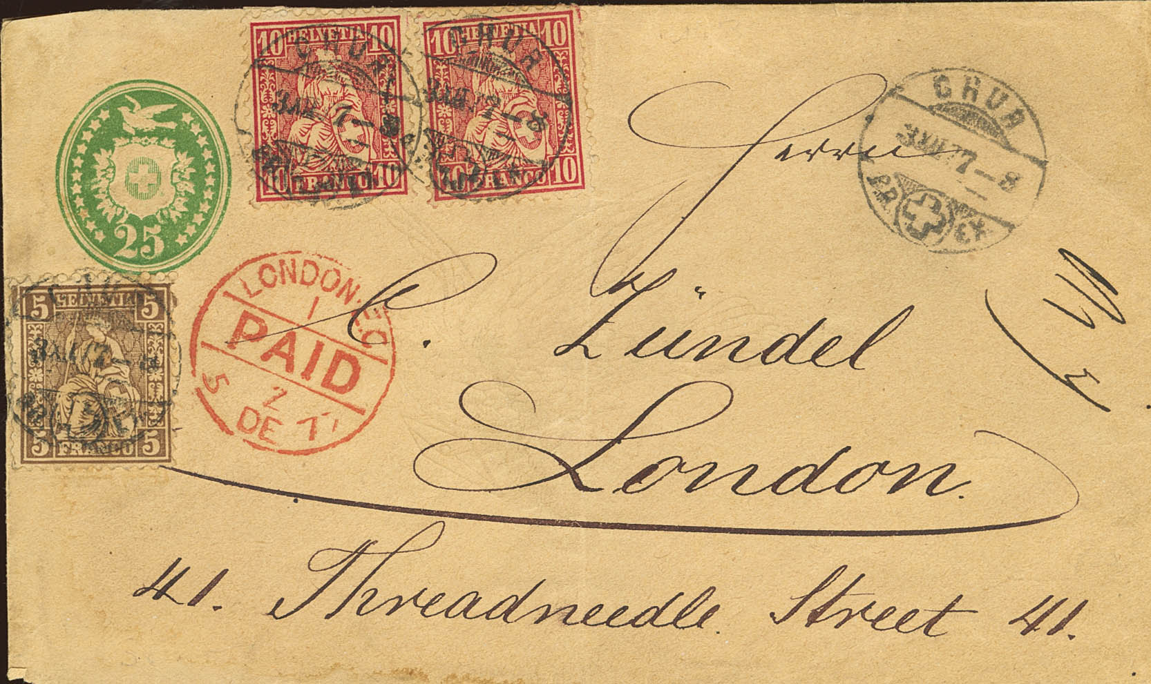 Yvert 35, 43(2). 1877. 25 cts verde sobre Entero Postal de CHUR a LONDRES (INGLATERRA), con franqueo complementario de 5 cts castaño y 10 cts rosa, dos sellos. MAGNIFICA.