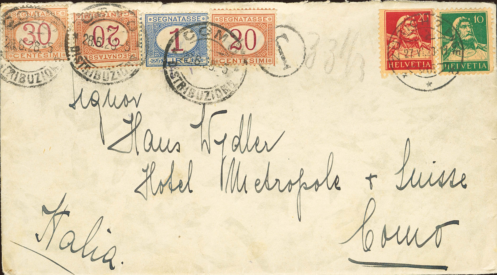 Yvert 200, 202. 1928. 10 cts verde y 20 cts rojo. ZURICH a COMO (ITALIA). Tasada a la llegada, aplicando sellos de tasa italianos de 20 cts, dos sellos, 30 cts y 1 lira. MAGNIFICA.
