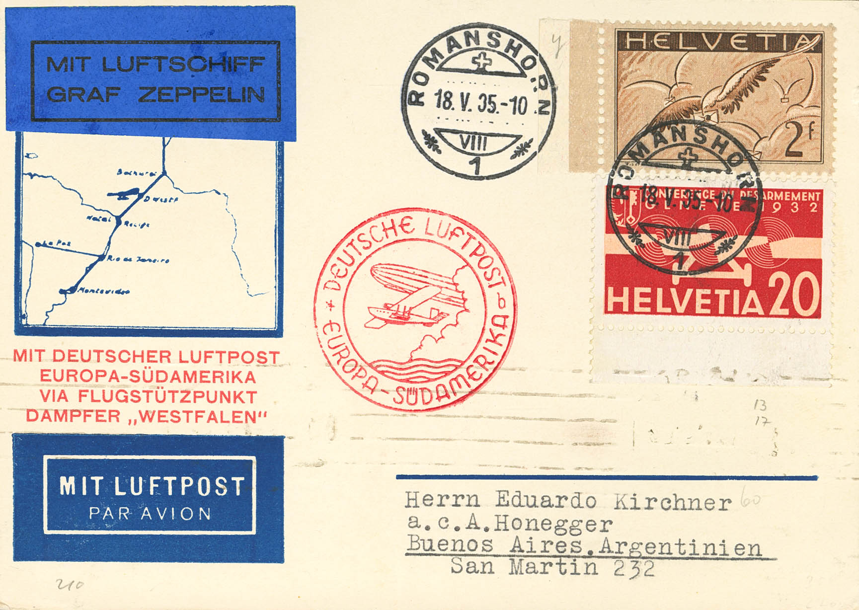 1935. 2 f castaño y 20 cts rojo y salmón. Tarjeta Postal por VUELO CATAPULTADO DESDE EL VAPOR ALEMAN WESTFALEN de ROMANSHORN a BUENOS AIRES (ARGENTINA). En el frente marcas DEUTSCHE LUFTPOST / EUROPA SUDAMERIKA y MIT DEUTSCHER LUFTPOST / EUROPA SUDAMERIKA / VIA FLUGSTUTZPUNKT / DAMPFER WESTFALEN, ambas en rojo. MAGNIFICA.