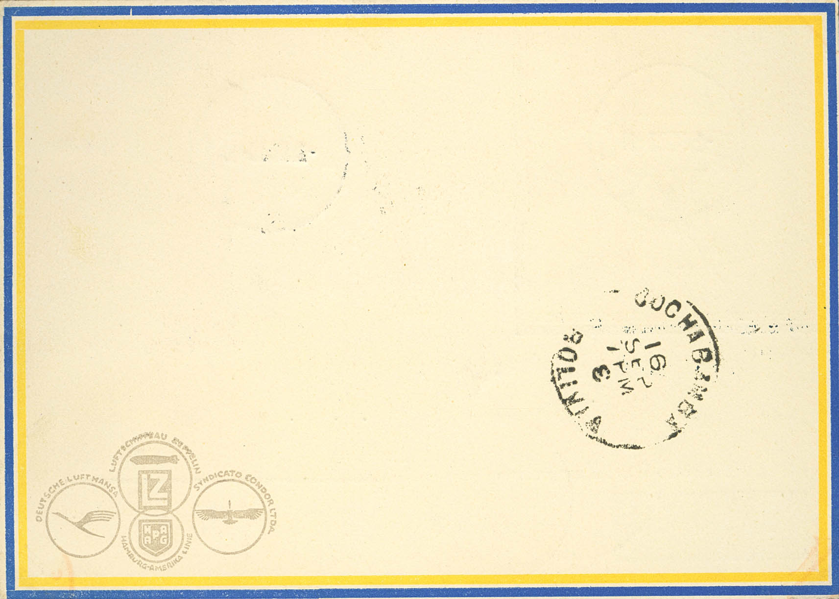 Yvert 17(2), 18(2). 1933. 20 cts rojo y salmón, dos sellos y 90 cts azul y azul claro, dos sellos. Tarjeta Postal Graf Zeppelin de ROMANSHORN a COCHABAMBA (BOLIVIA). En el frente marca LUFTSCHIFF GRAFF ZEPPELIN / 6.SUDAMERIKAFAHRT-1933, en negro y tránsito FRIEDRICHSHAFEN. MAGNIFICA Y RARO DESTINO.