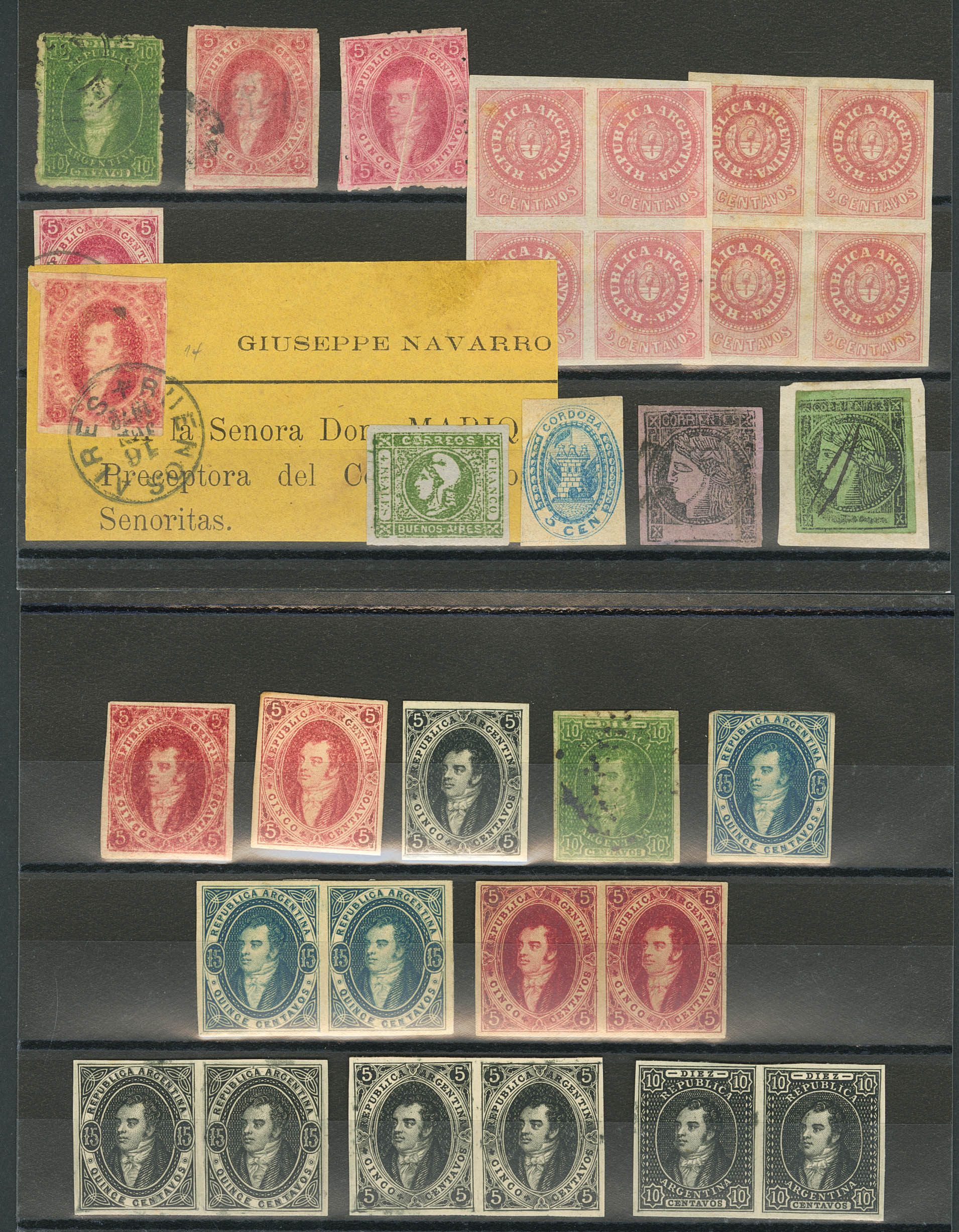 (★)(1862ca). Interesante conjunto de sellos clásicos nuevos y usados de las emisiones de Rivadavia y Escuditos (dos bloques de cuatro del 5 ctvos rosa), incluye varios ensayos de plancha y de color de la emisión de Rivadavia, algunos en parejas y varios sellos de Buenos Aires, Córdoba y Corrientes. MAGNIFICO E INUSUAL CONJUNTO.