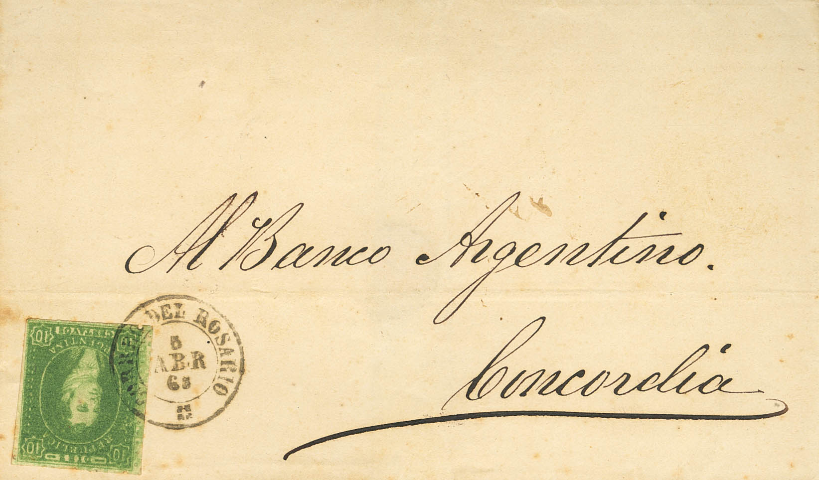 Yvert 12. 1865. 10 cts verde IMPRESION SEMIBORROSA. ROSARIO a CONCORDIA. Matasello fechador CORREO DEL ROSARIO. MAGNIFICA. (Kneutschel 21c)