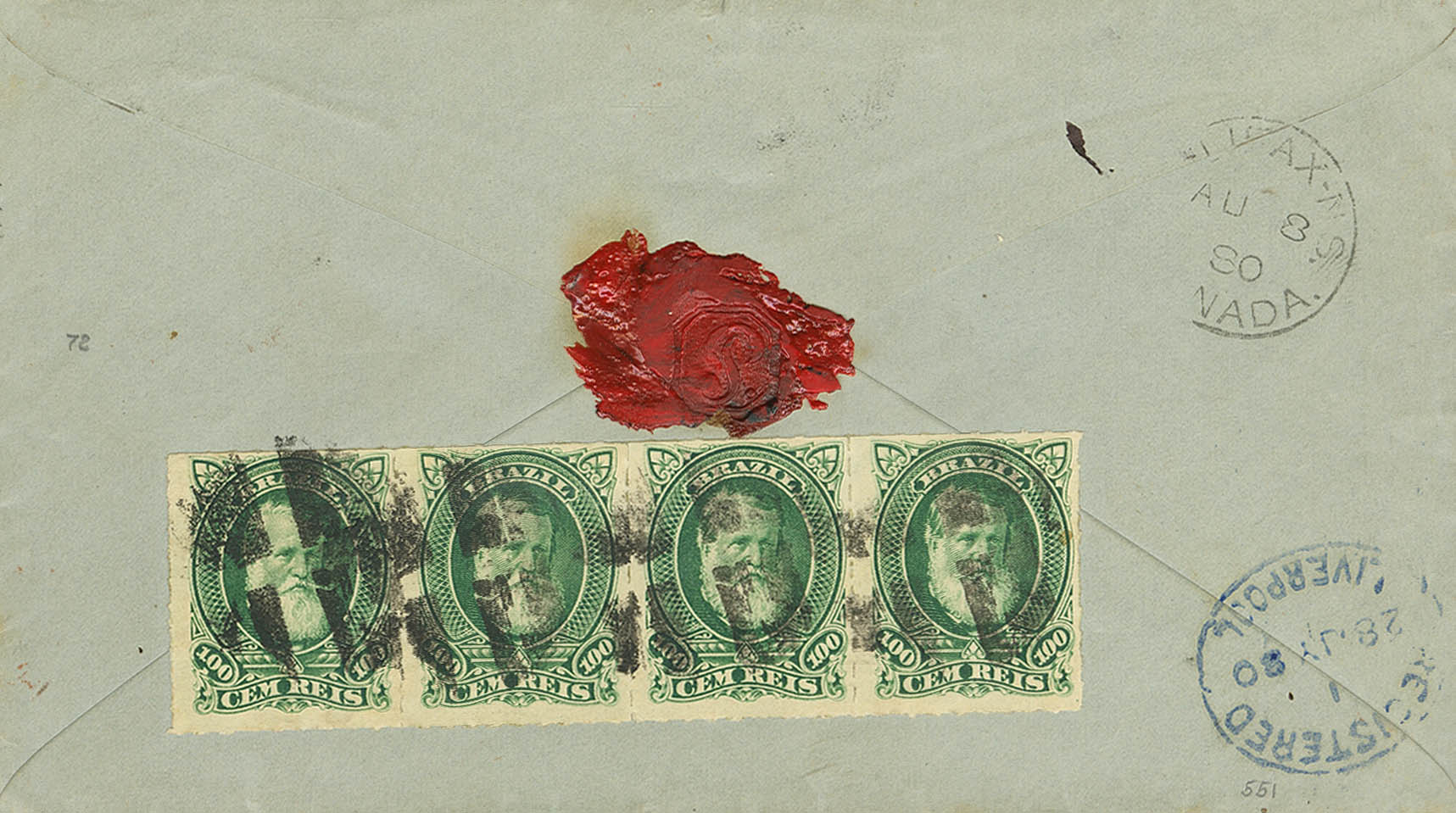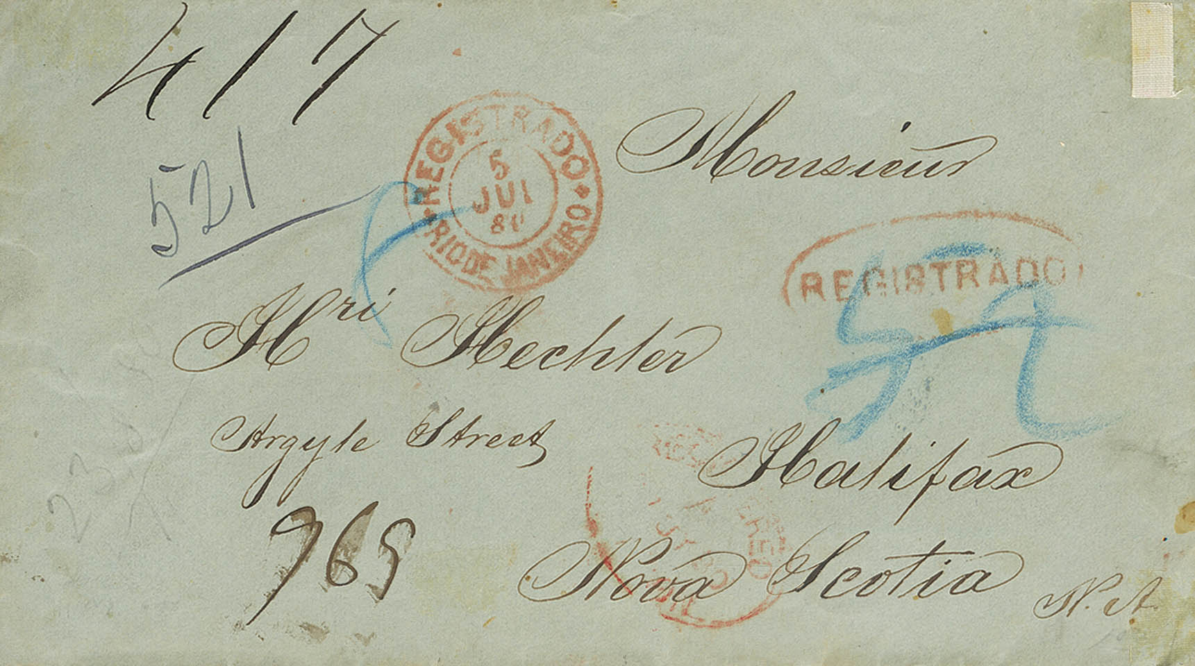 Yvert 41(4). 1880. 100 reis verde, tira de cuatro (franqueada en el reverso). Certificado de RIO DE JANEIRO a HALIFAX (CANADA). Fechador REGBTADO / RIO DE JANEIRO y marca oval REGISTADO, ambas en rojo, tránsito REGISTERED LONDON y al dorso fechador oval REGISTERED / LIVERPOOL y llegada. MAGNIFICA Y RARO DESTINO, ESPECIALMENTE CON UN DOBLE CRUCE TRANSATLANTICO.