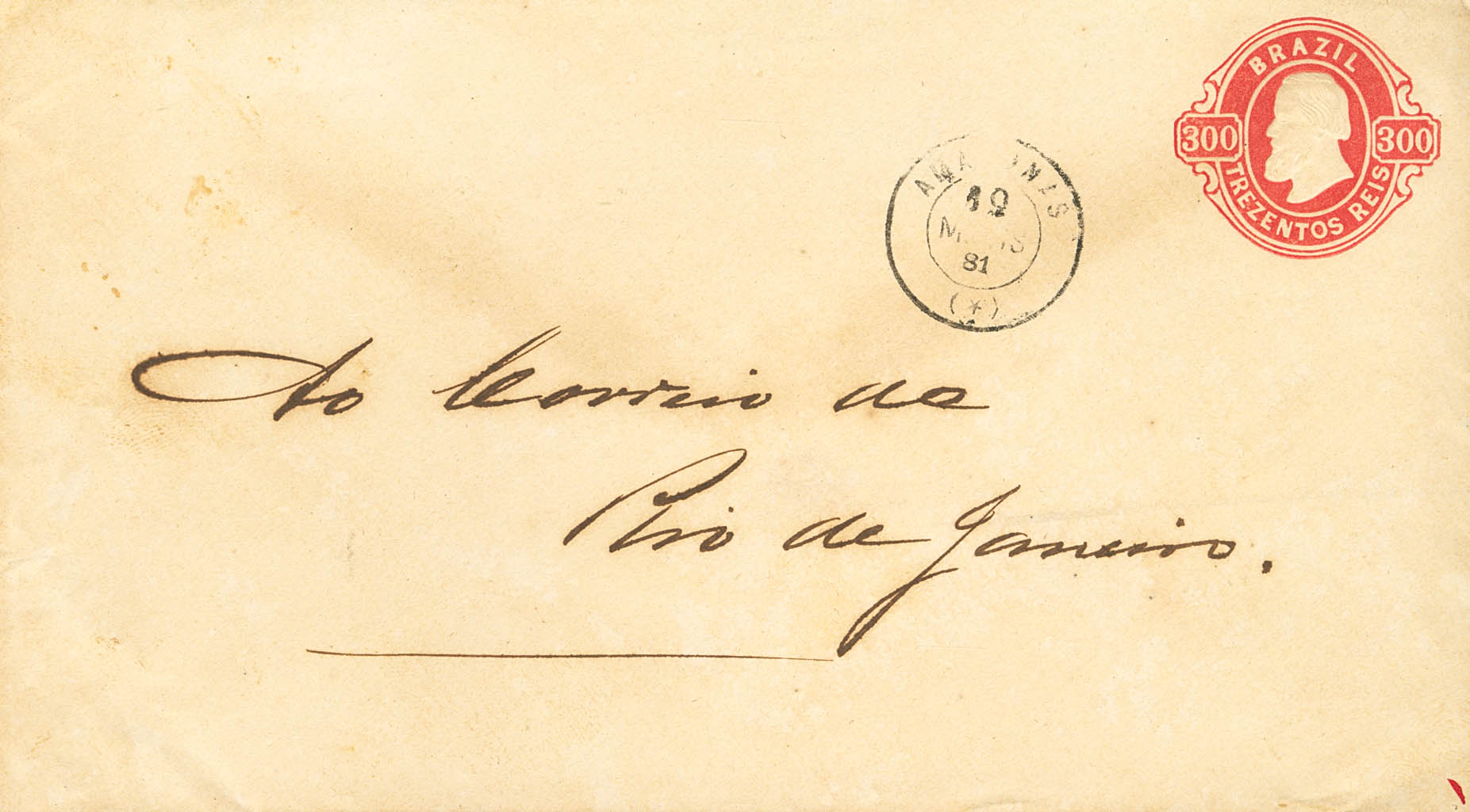 1881. 300 reis rojo sobre Entero Postal dirigido a RIO DE JANEIRO. En el frente fechador tipo francés AMAZONAS / (*). MAGNIFICO Y MUY RARO CON ORIGEN DEL AMAZONAS.