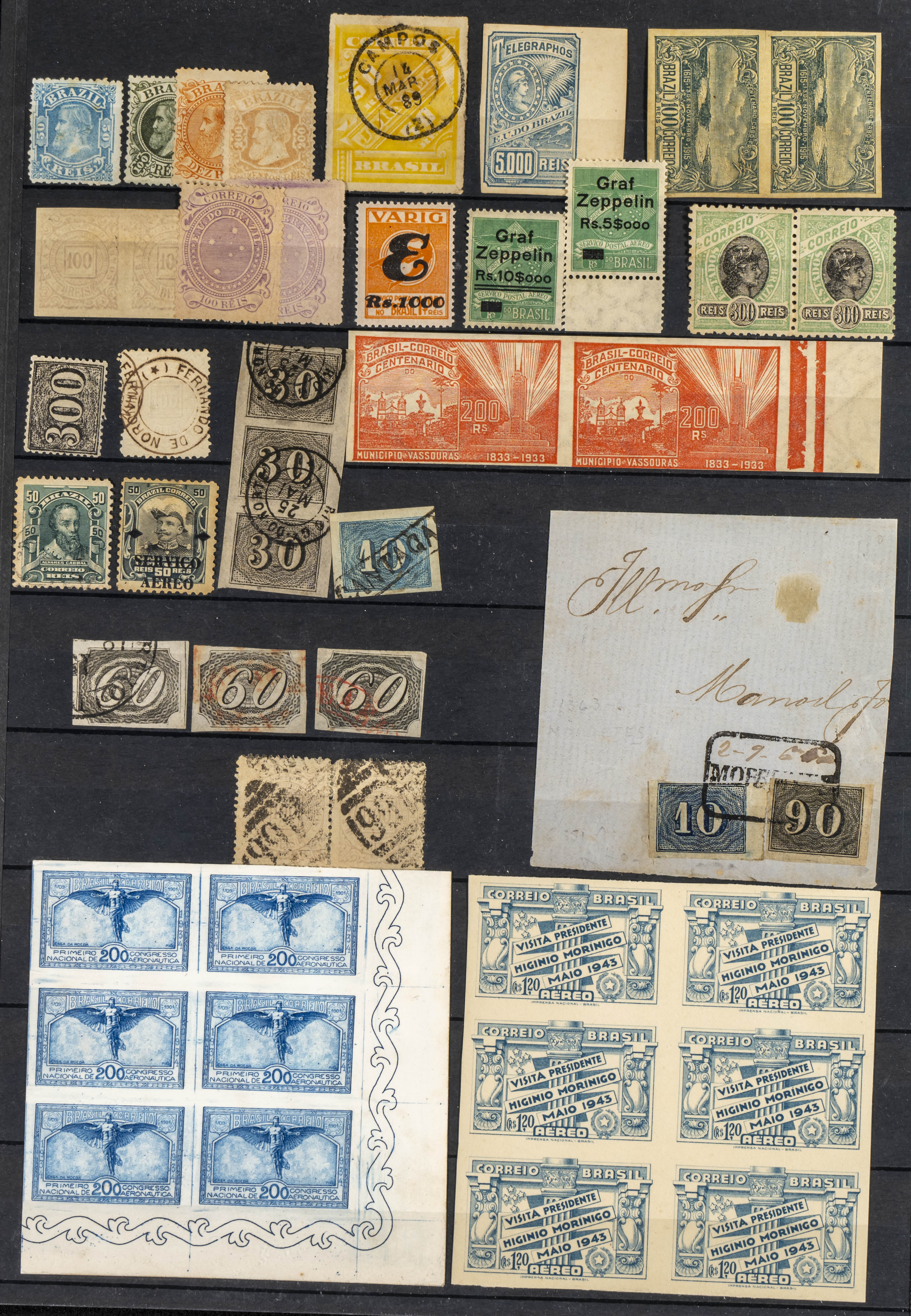 ★/(1844ca). Interesante conjunto de sellos sueltos y variedades de Brasil entre 1844 y 1943, en nuevo y usado, la parte clásica en usado incluyendo dos sellos de 280 reis rojo (nuevo y usado), un fragmento con 10 reis azul y 90 reis negro de 1854, un 300 reis nuevo de 1850 dentado entre otros, y a partir de 1900 incluye variedades y Ensayos de color o de plancha, algunos en bloques, así como dos sellos de Zeppelin de 1930 y uno de Varig del mismo año. ALTO VALOR DE CATALOGO. A EXAMINAR.