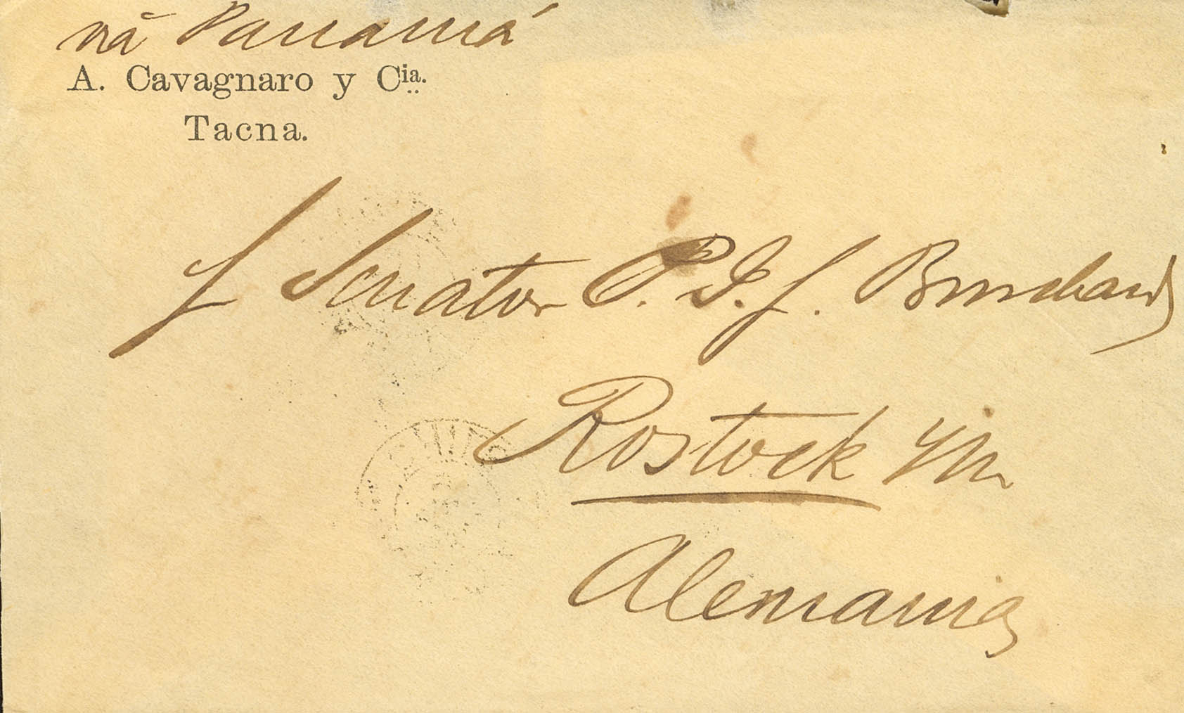 Yvert Telégrafos 1(2). 1891. 2 ctvos castaño claro de Telégrafos, pareja (franqueado al dorso). TACNA a ROSTOCK (ALEMANIA). Matasello ARICA / CHILE sobre los sellos al dorso y llegada, por falta de suministro de sellos de correos, algunos sellos de telégrafos fueron autorizados para el uso postal entre el 21 de Abril y 30 de Septiembre de 1891. MAGNIFICA Y RARA, ULTIMO DIA DEL USO POSTAL PARA SELLOS DE TELEGRAFOS.