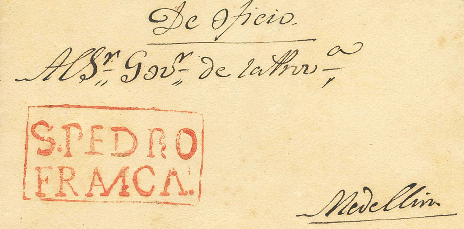 1828. SAN PEDRO a MEDELLIN. Marca S.PEDRO / FRANCA, en rojo, igual a la utilizada durante el periodo colonial español. MAGNIFICA Y MUY RARA.