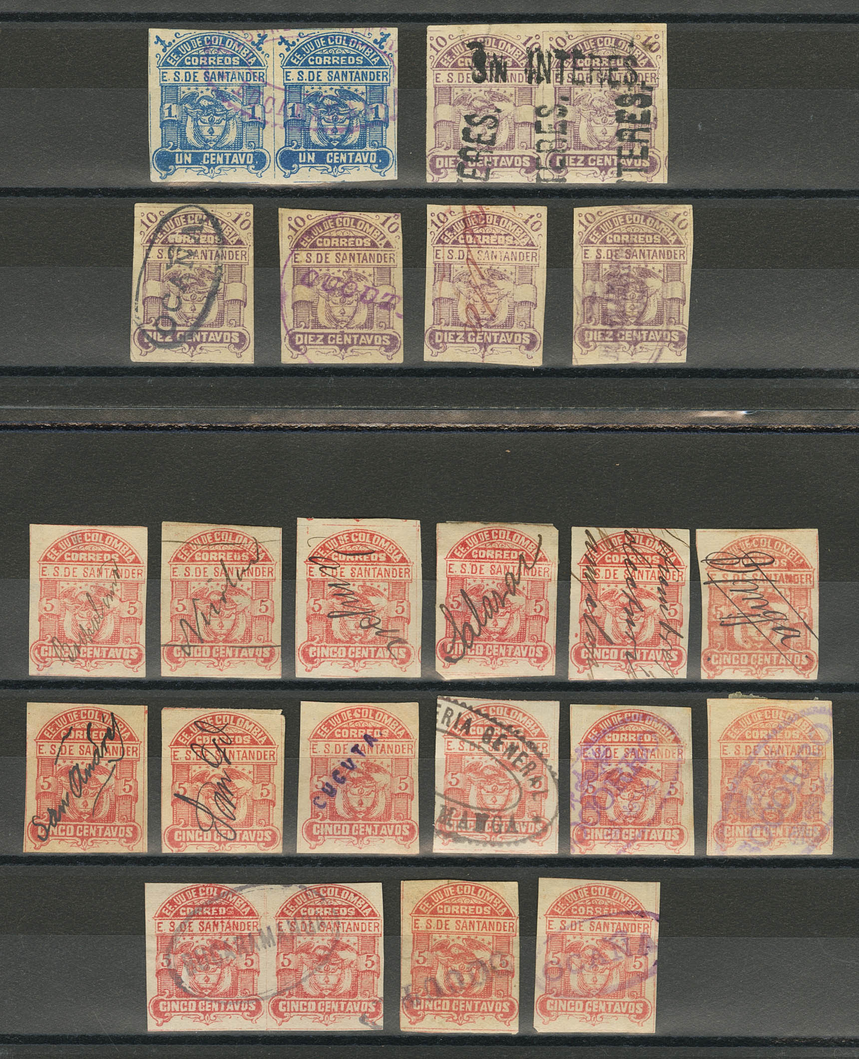 1886. Interesante conjunto de dieciocho sellos y tres parejas de 1 ctvo, 5 ctvos y 10 ctvos de la segunda emisión de 1886 con matasellos diversos, la mayoría inutilizados a pluma con diferentes nombres de poblaciones como Cochalema, Campú, Nicolás y Salazar, entre otras y varios ovales de Bucaramanga, Socorro y Ocaña, entre otros (algún sello leves defectos sin importancia alguna). BONITO Y RARO CONJUNTO.