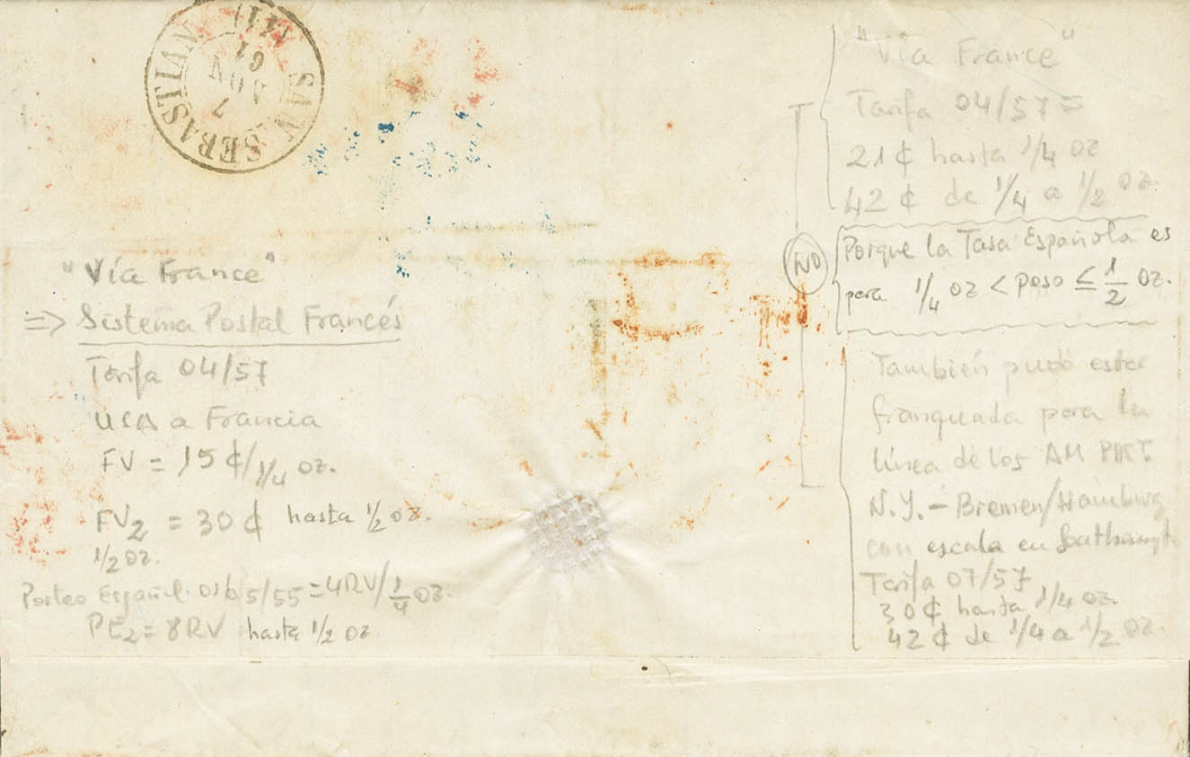 Yvert 25. 1861. 30 cts naranja (defecto sin importancia). NUEVA YORK a SAN SEBASTIAN, circulada por el correo francés por el vapor Asia. Matasello PARRILLA CIRCULAR, en rojo y en el frente fechador NEW / PAID / YORK, ambulante francés ETATS-UNIS / SERV.BRIT.CALAIS y porteo español "8 Rs" (reales). MAGNIFICA Y MUY RARA.
