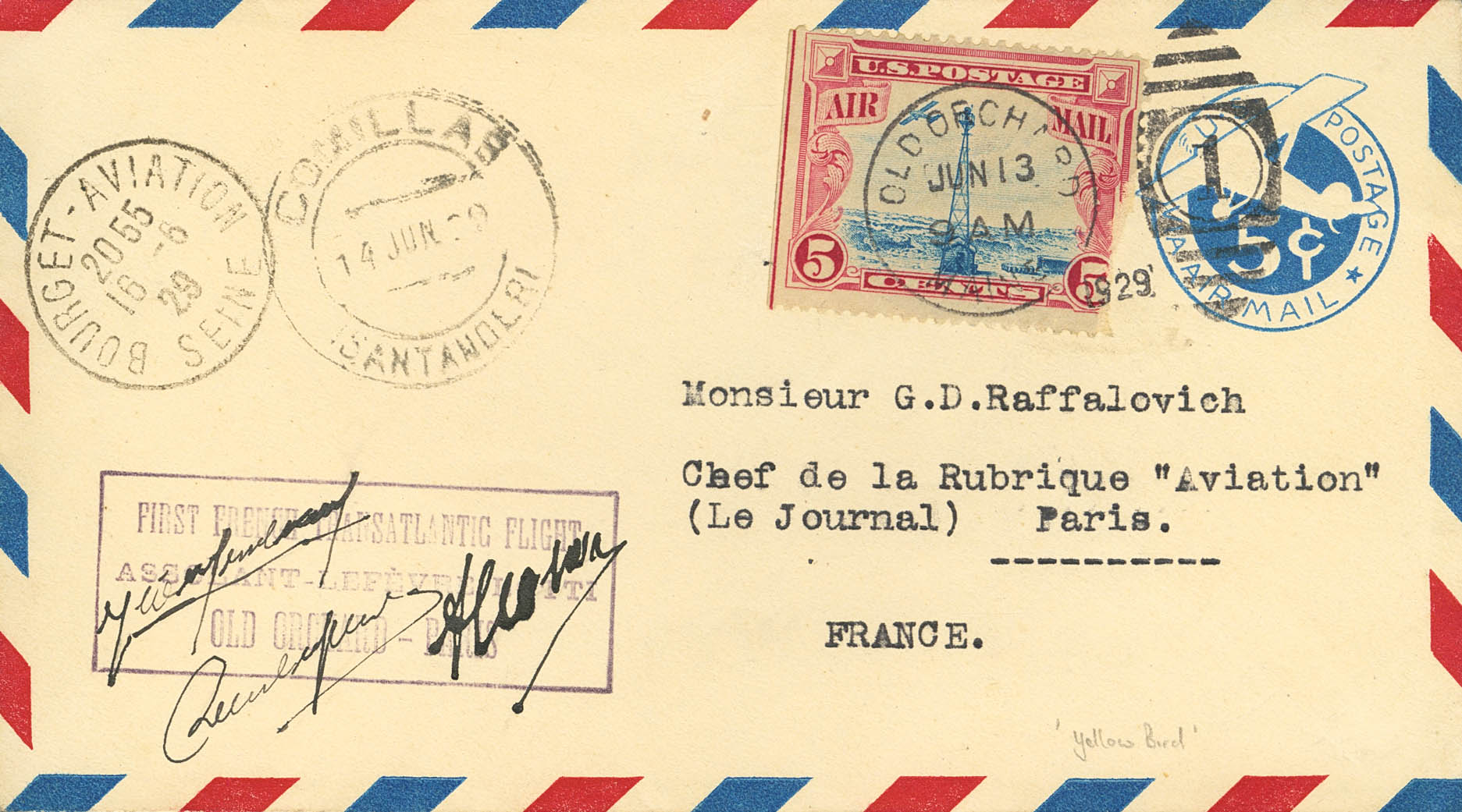 1928. 5 cts azul sobre Entero Postal de OLD ORCHARD (MAINE) a FRANCIA. Vuelo del Yellow Bird atravesando el Océano Atlántico que tuvo que aterrizar en Comillas (España) por falta de combustible. En el frente marca FIRST FRENCH TRANSATLANTIC FLIGHT / ASSOLANT-LEFEVRE-LOTTI / OLD OLCHARD-PARIS, firma de los tres pilotos y fechadores COMILLAS / (SANTANDER) y BOURGET-AVIATION / SEINE (se incluye una breve historia del vuelo que aparte de haber realizado la mayor distancia sobre mar abierto, es el primer vuelo que cruzó el Océano Atlántico con un polizón a bordo). MAGNIFICA Y MUY RARA.