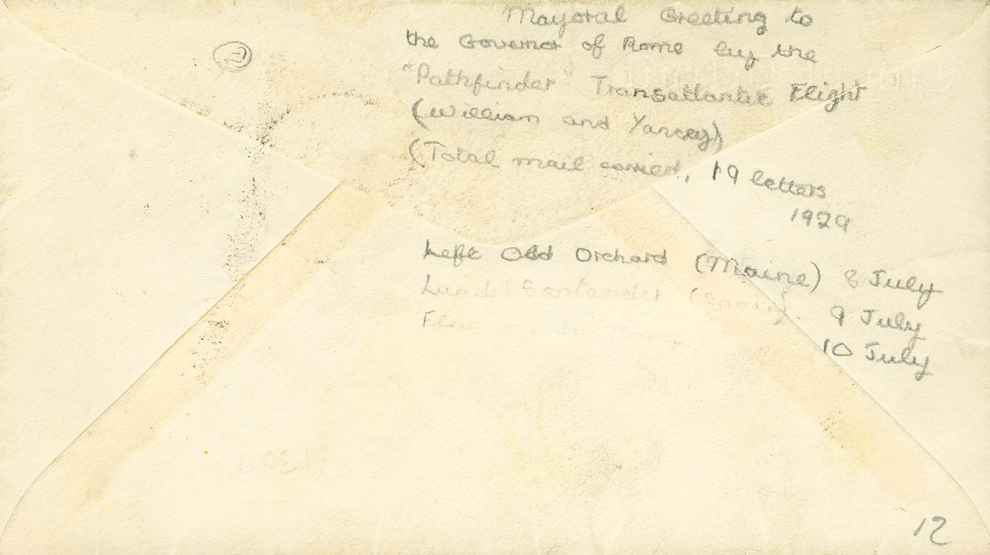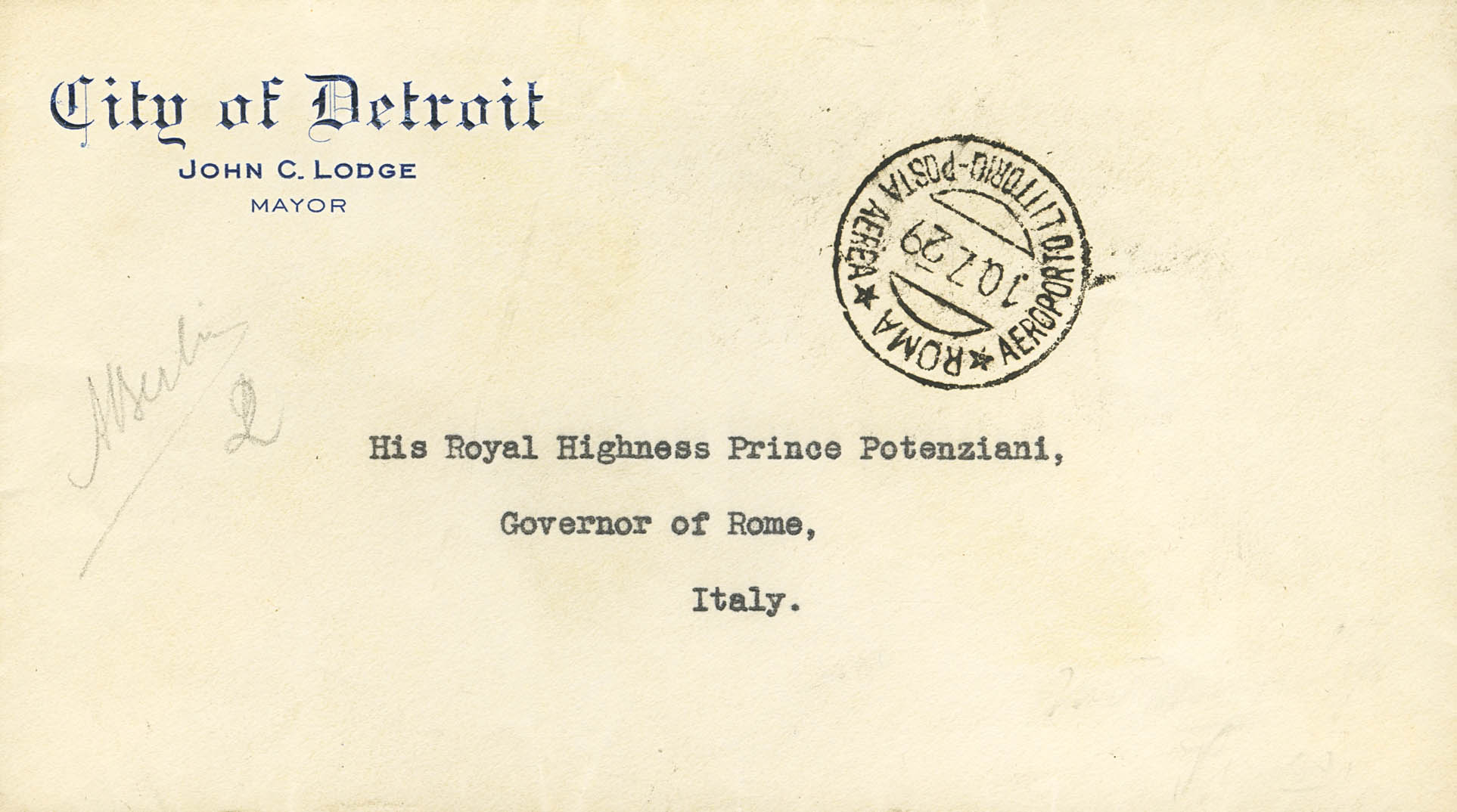 1929. Sobre sin franquear de DETROIT a ROMA, transportada en el vuelo transatlántico del Pathfinder desde Old Orchard a Santander y Roma. Fechador ROMA / AEROPORTO LITTORIO POSTA AEREA, aplicado en destino. MAGNIFICA Y MUY RARA, SOLO SE TRANSPORTARON DIECINUEVE CARTAS EN ESTE VUELO TRANSATLANTICO.