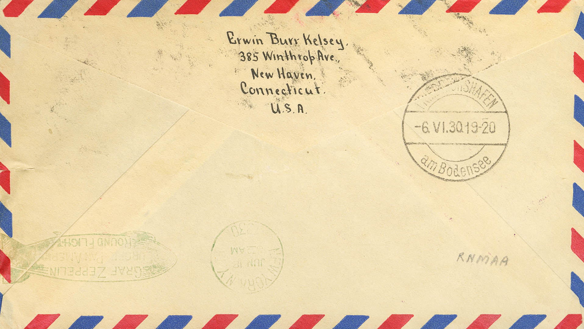 14, 15. 1930. 1´30 d castaño y 2´60 d azul. NUEVA YORK a NEW HAVEN. En el frente marcas LUFSCHIFF GRAF ZEPPELIN / SUDAMERIKA FAHRT 1930, en rojo y FIRST / EUROPE PAN-AMERICA / ROUND FLIGHT, en violeta, al dorso tránsito FRIEDRICHSHAFEN y rodillo especial del Graf Zeppelin NEW YORK N.Y., en verde. MAGNIFICA Y RARA.