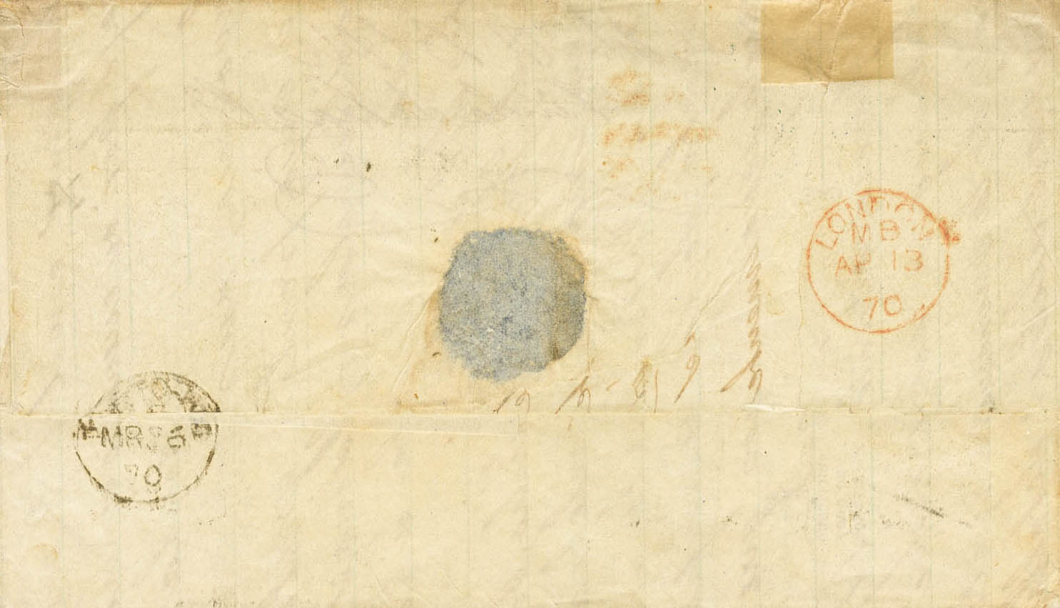 1870. SAN JUAN a CADIZ. Marcas FRANCO, en negro, VIA DE YNGLATERRA, en azul y porte "2 R" aplicado a la llegada. MAGNIFICA Y RARA.