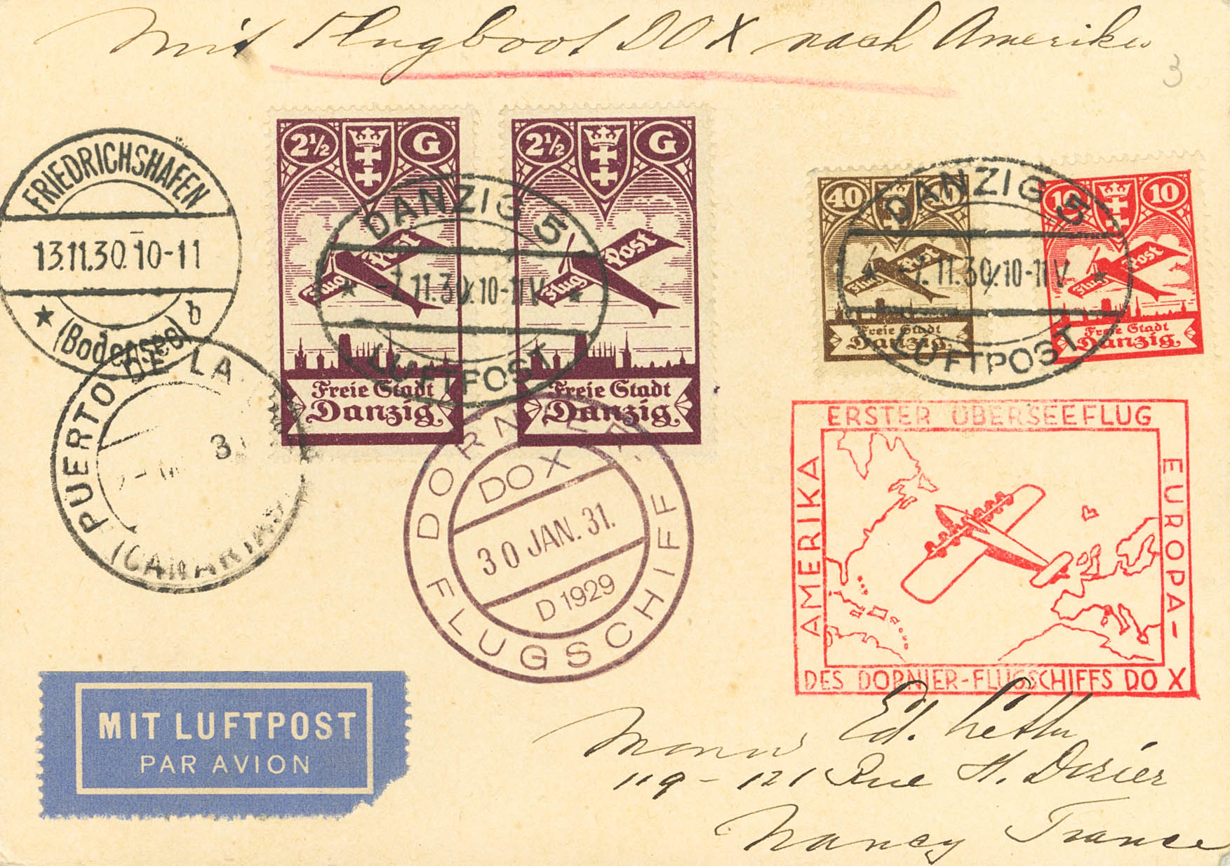 Yvert 20, 22, 24(2). 1930. 10 p rojo, 40 p castaño y 2½ g castaño lila. Tarjeta Postal de DANZIG a NANCY (FRANCIA), transportada por el Dornier X. En el frente fechador y marca del vuelo, tránsitos FRIEDRICHSHAFEN y PUERTO DE LA LUZ (CANARIAS) y anotación manuscrita "Mit flugboot DOX nach Amerika". MAGNIFICA Y MUY RARA.