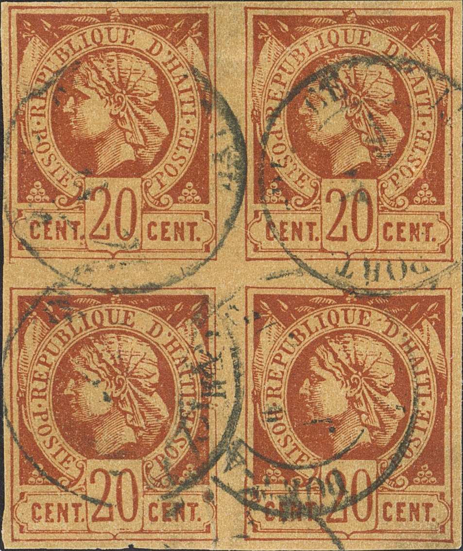Yvert 6(4). 1881. 20 cts castaño amarillo sobre crema, bloque de cuatro (dos pliegues del papel sin importancia). Matasello PORT AU PRINOE, en negro. BONITO Y RARISIMO.