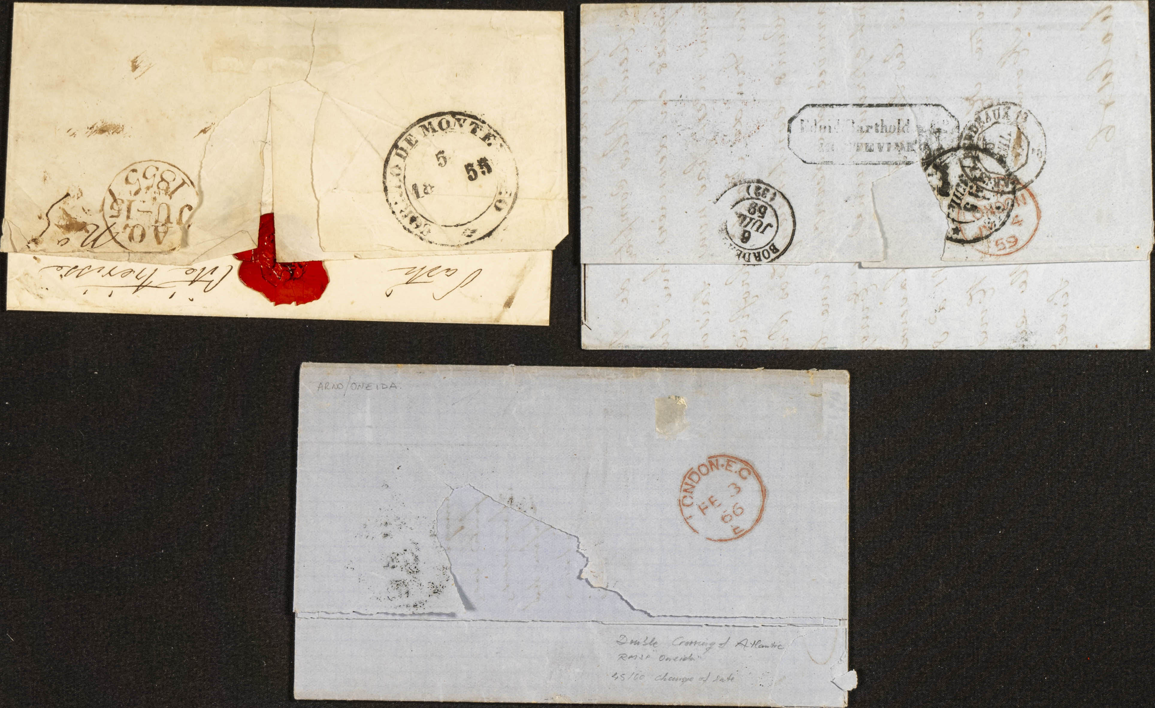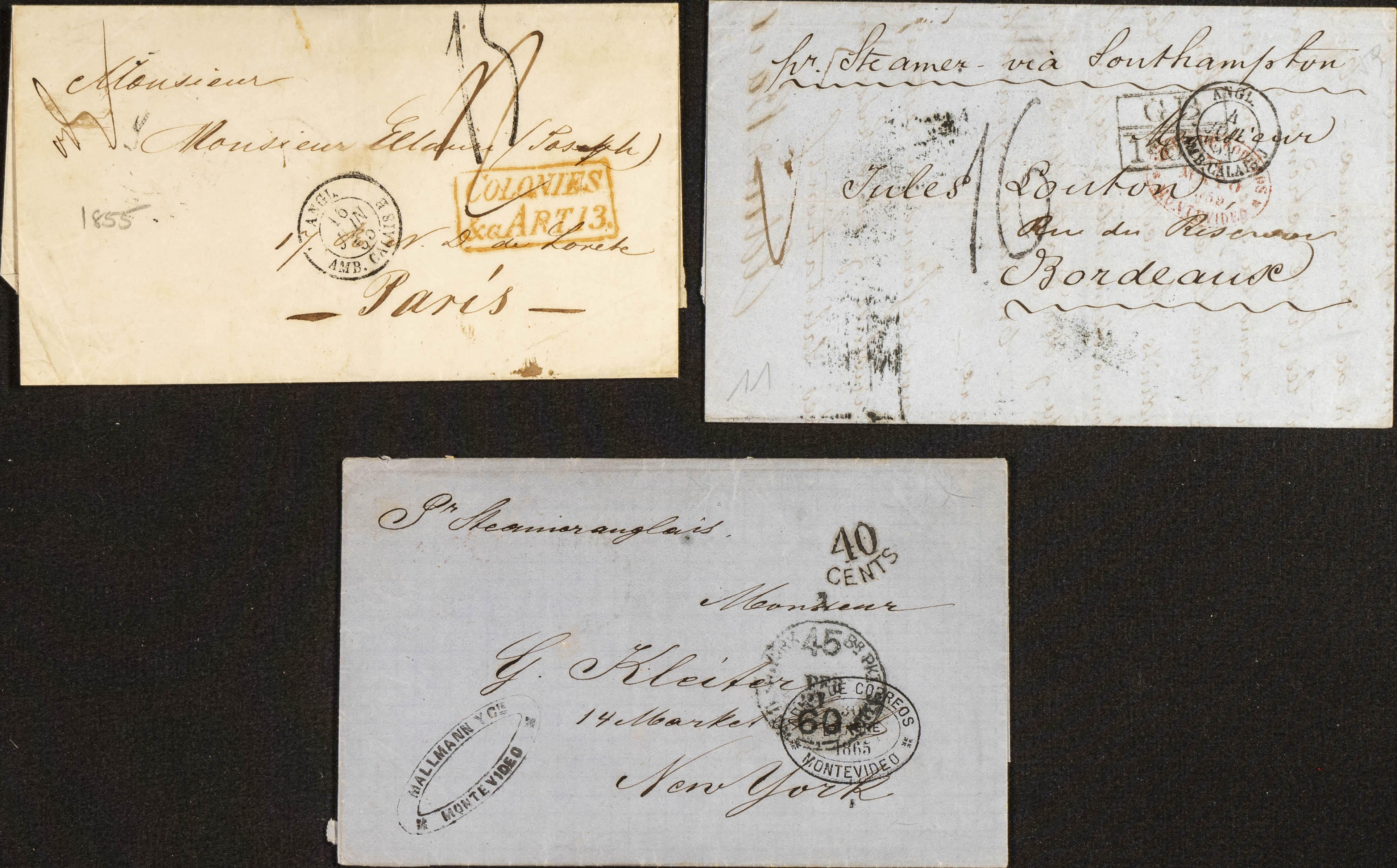 1865. Conjunto de tres cartas con origen en MONTEVIDEO circuladas entre 1855 y 1865, una dirigida a Nueva York vía Londres con doble cruce transatlántico y las otras a París y Burdeos por vía Inglesa. MAGNIFICAS.