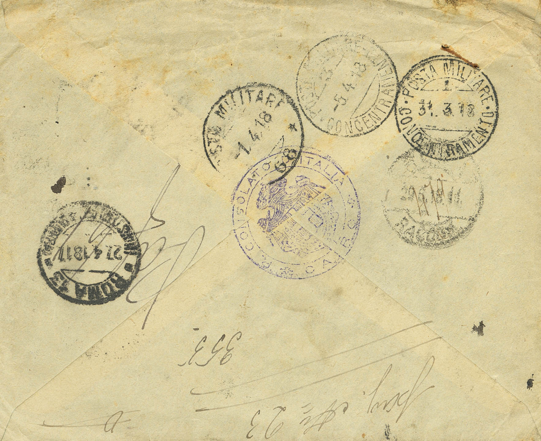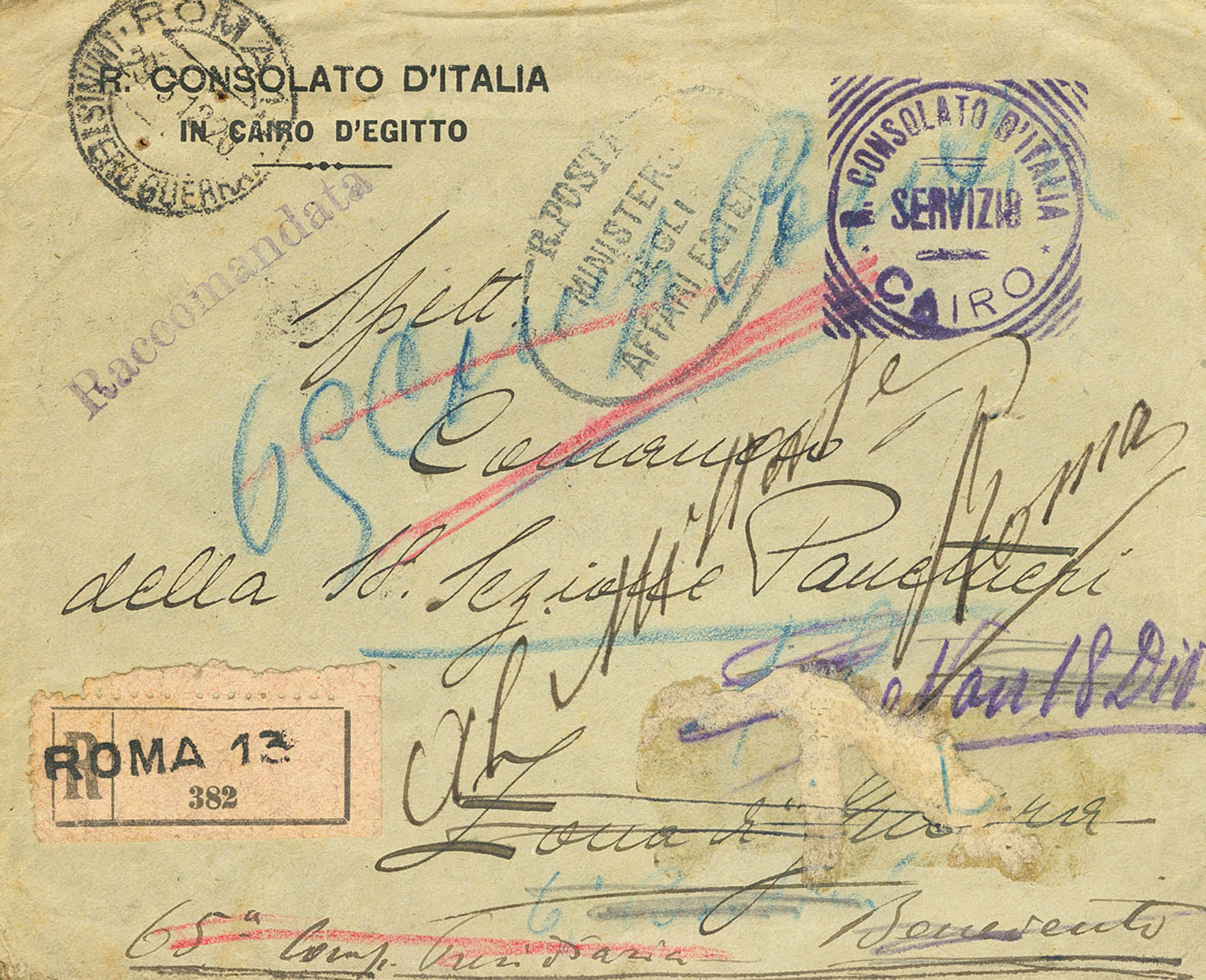 1918. EL CAIRO a ROMA (ITALIA), circulada por vía diplomática y reexpedida por correo certificado a un militar italiano al frente siendo reexpedida varias veces sin llegar a su destino, por lo que fue devuelta al remitente. En el frente marcas CONSOLATO D´ITALIA / SERVIZIO / CAIRO y R.POSTE / MINISTERIO / DEGLI / AFFARI ESTERO, al dorso diversos fechadores y marca del Consulado Italiano de El Cairo. MAGNIFICA Y MUY RARA.