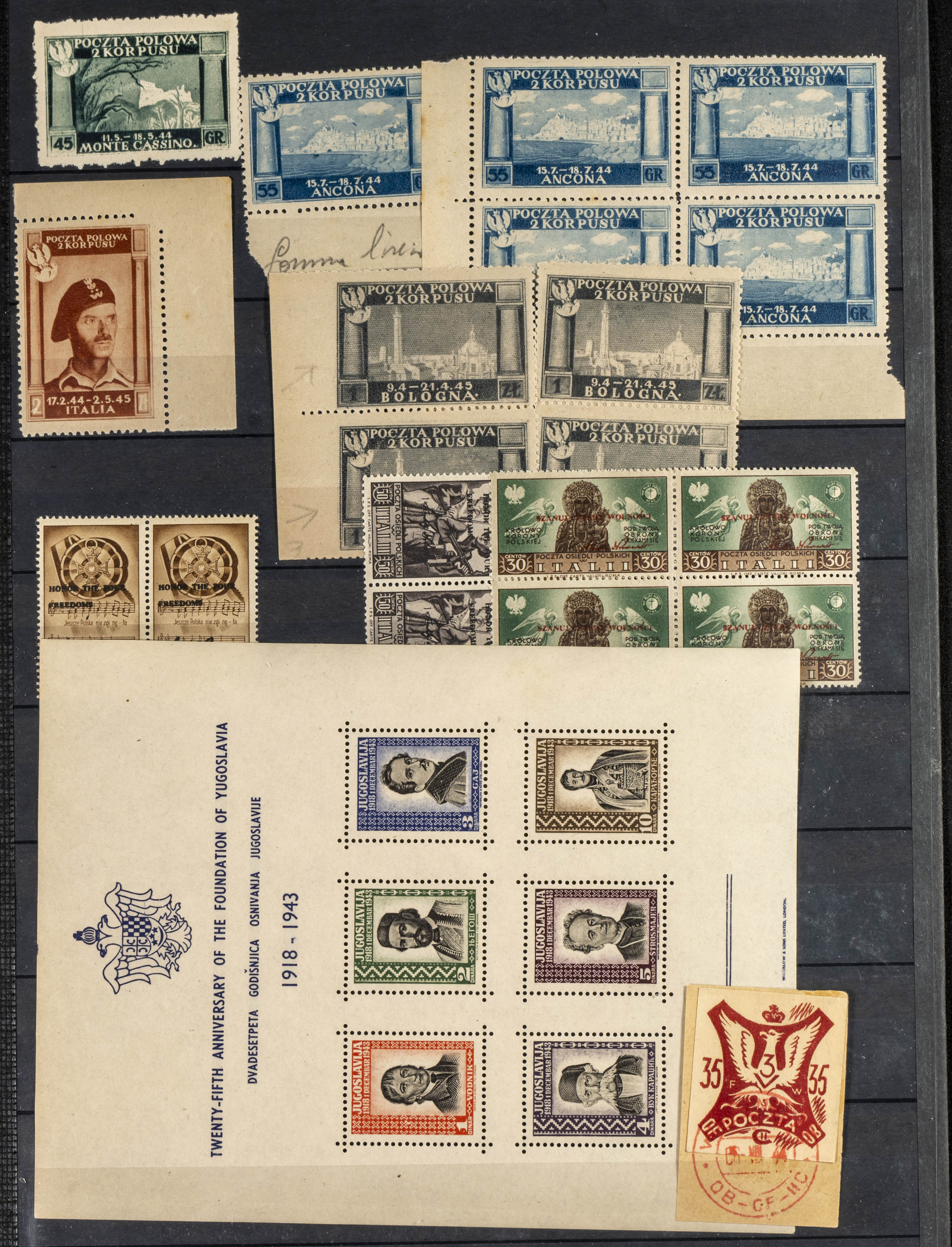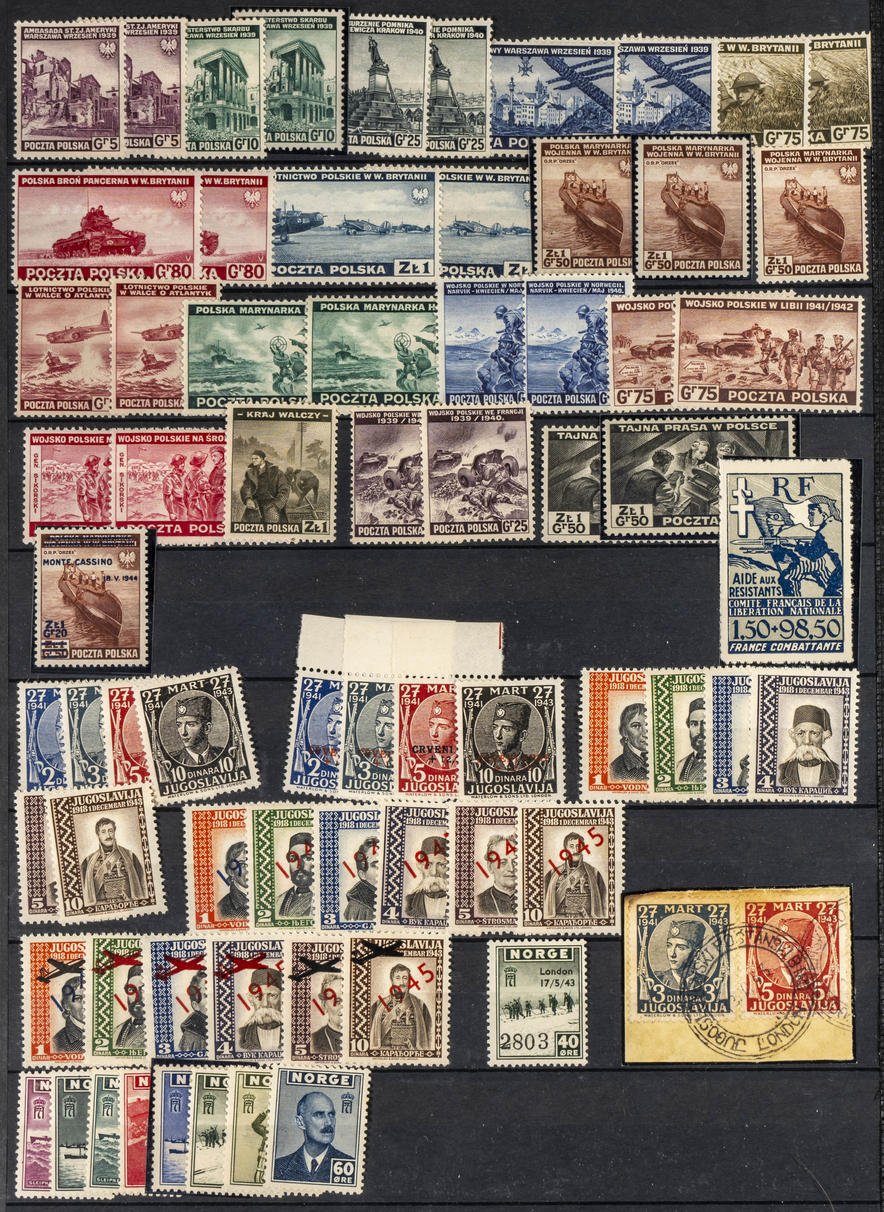 (1942ca). Interesante conjunto de sellos sueltos y series completas, además de una hoja bloque de Polonia, Yugoslavia y Noruega emitidos en el exilio durante la II Guerra Mundial en nuevo, incluye alguna variedad y algún sello usado de Polonia y Yugoslavia. A EXAMINAR.