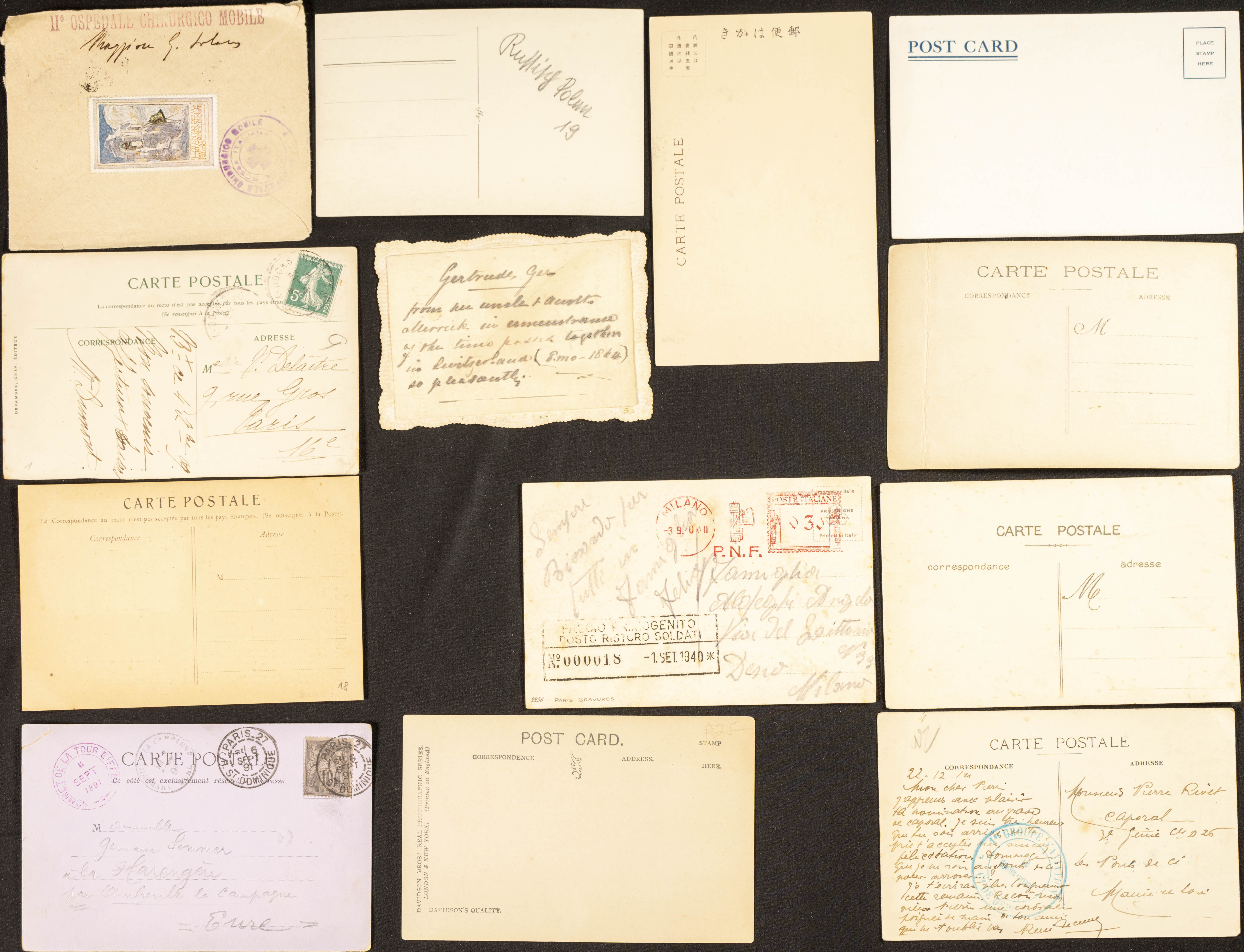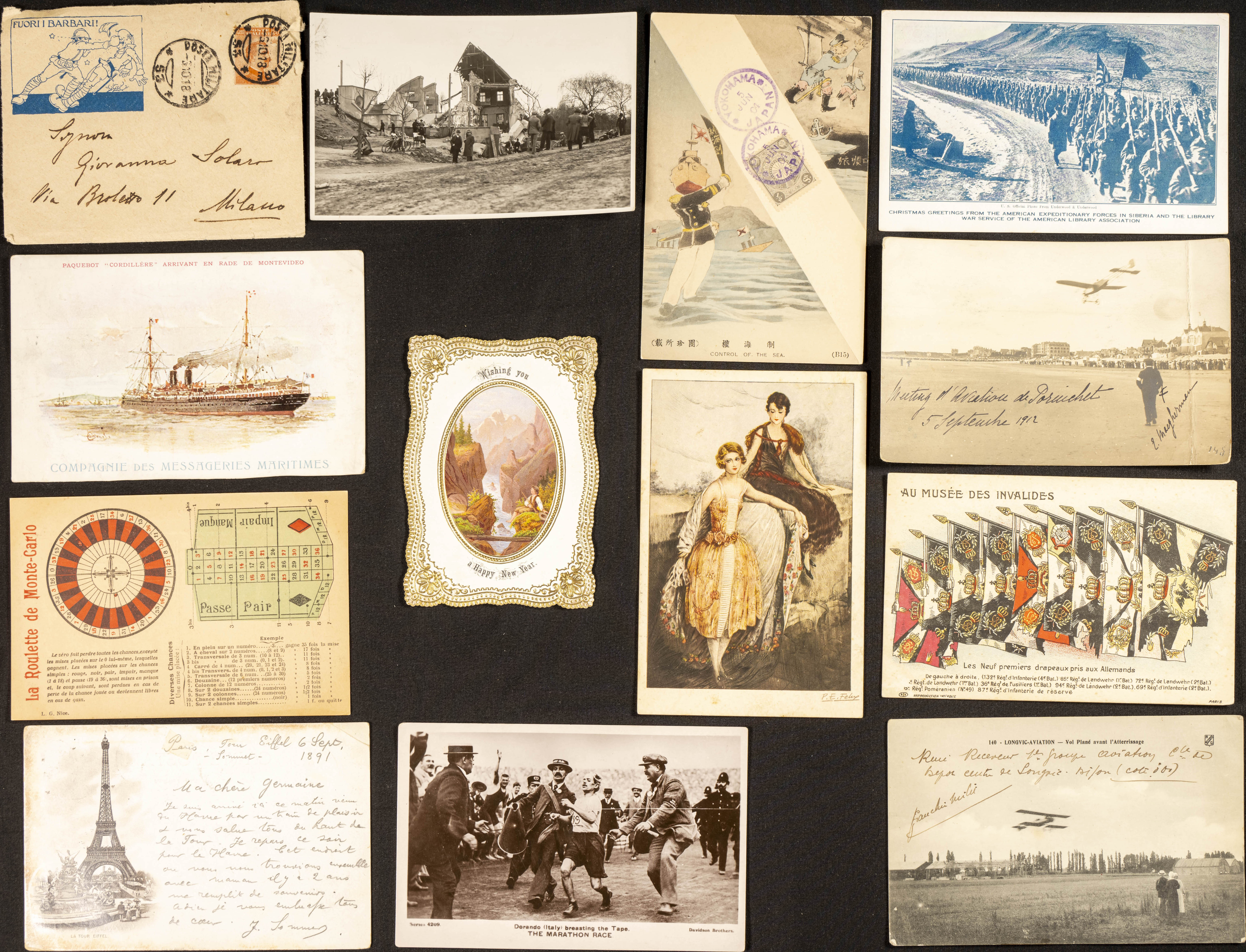 (★)/(1895ca). Conjunto de doce tarjetas postales ilustradas o fotográficas de diversos países entre 1895 y 1920, alguna circulada, destacan dos de Francia de 1912 con imágenes de Aviones, una de Estados Unidos del Ejército Expedicionario en Siberia de 1918 y una de Japón de 1904 (Control of the seas), entre otras e incluye una carta de Italia con ilustración FUORI I BARBARI de 1918. MAGNIFICAS Y RARO CONJUNTO.