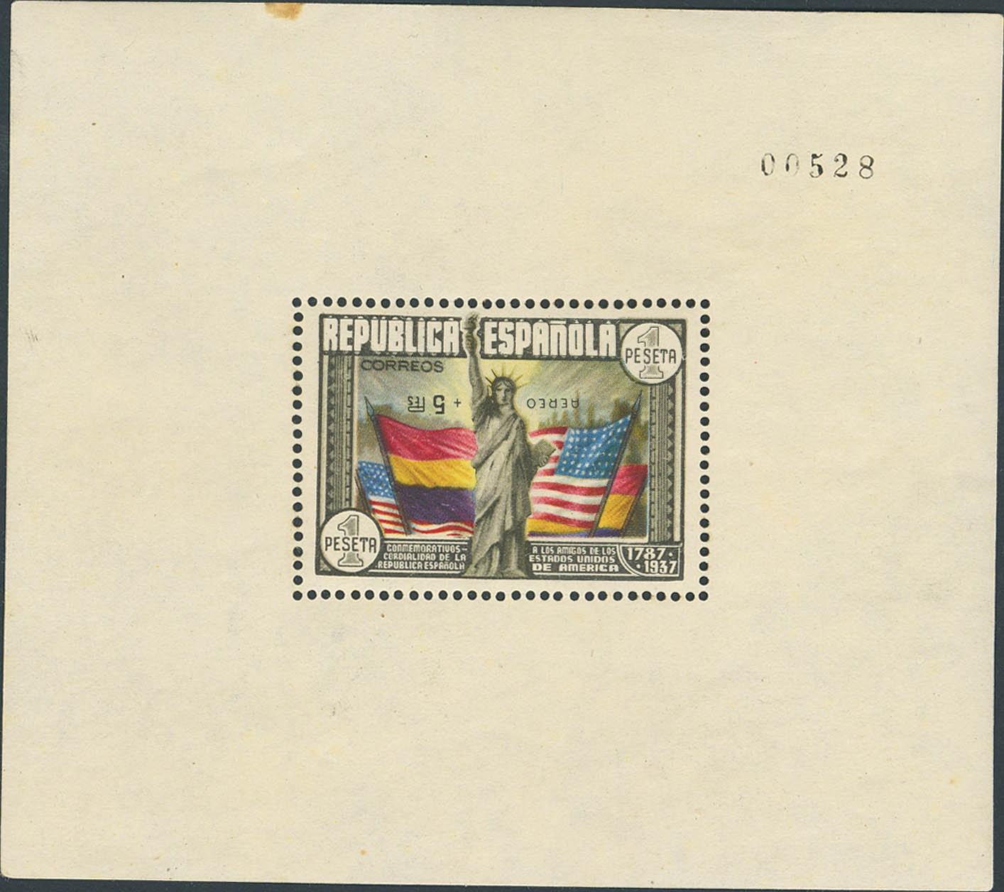★ 766hi. 1938. AEREO+5 PTS. HABILITACION INVERTIDA (Nº 00528, numeración privada). MAGNIFICA. Cert. COMEX. Edifil 2020: 825 Euros