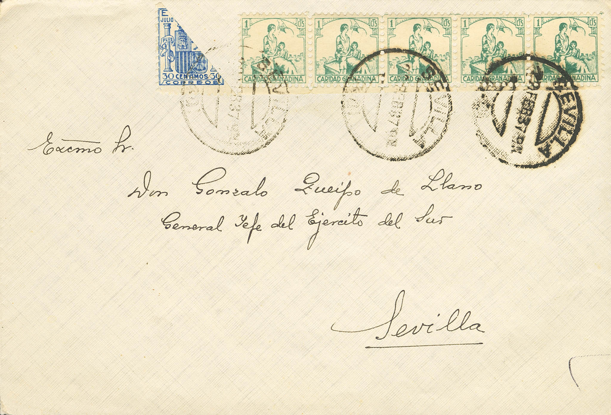 801. 1937. 30 cts azul bisectado y Benéfico de 1 cts verde, tira de cinco. Carta filatélica de Correo Interior de SEVILLA. MAGNIFICA.
