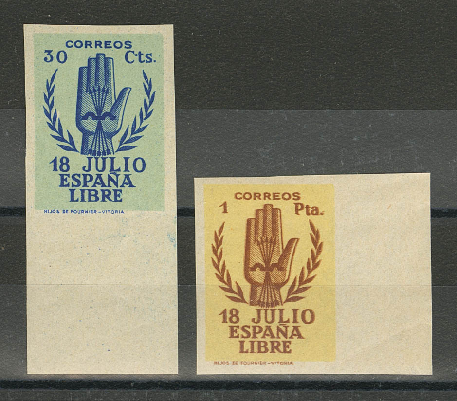 ★★ 853efs, 854efs. 1938. 30 cts azul y 1 pts amarillo. FALTA DEL FONDO FRANCO y SIN DENTAR. MAGNIFICOS Y RAROS. Edifil 2021: 760 Euros