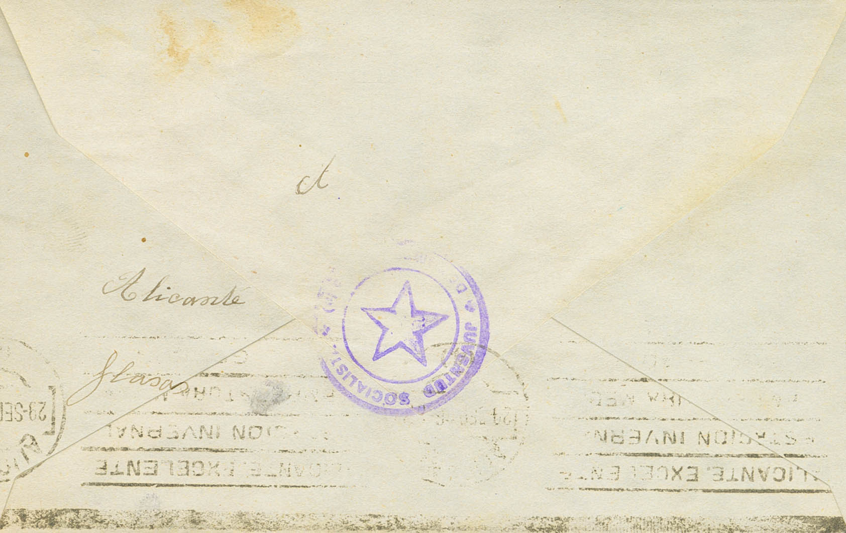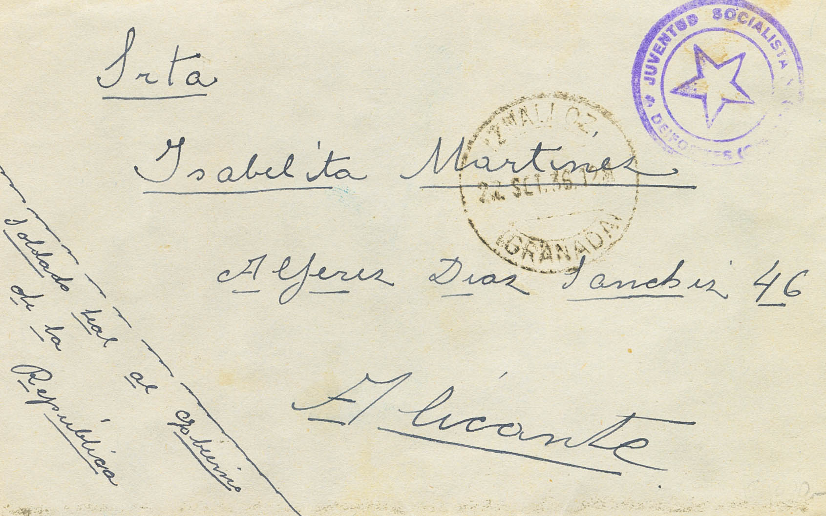 1936. DEIFONTES (GRANADA) a ALICANTE. Marca JUVENTUDES SOCIALISTAS / DEIFONTES (GRANADA), al dorso llegada. MAGNIFICA.