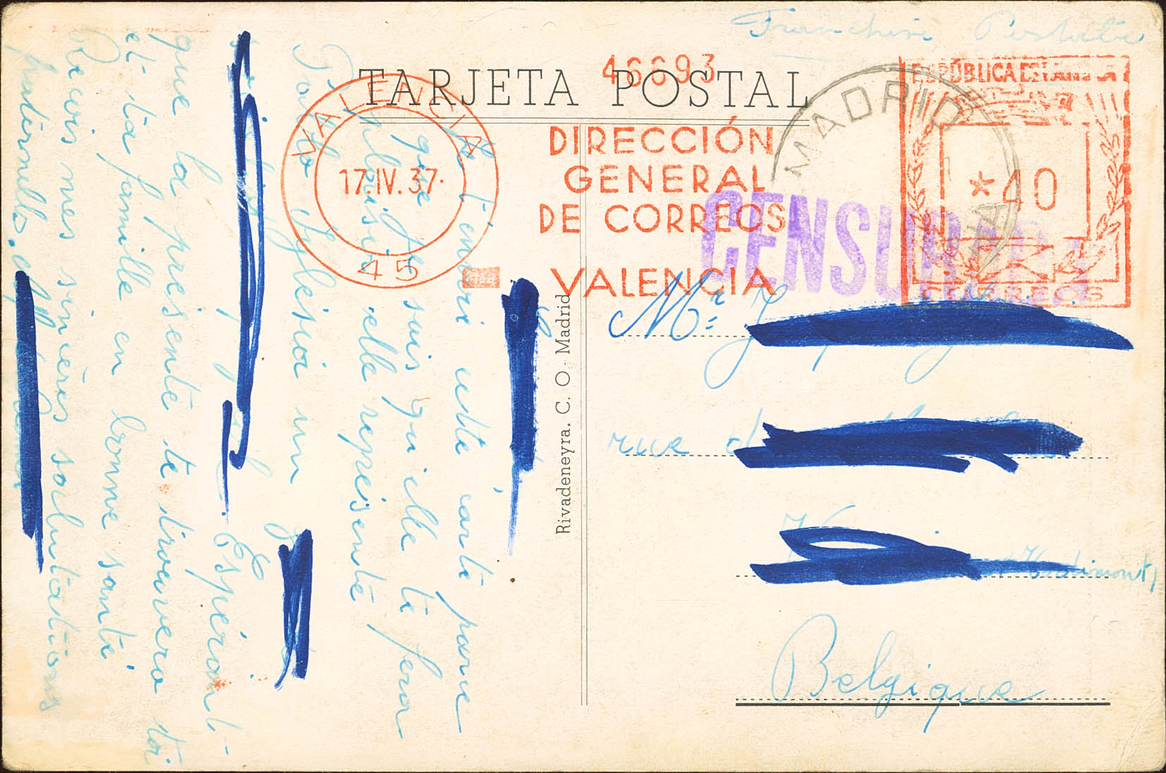 1937. 40 cts rojo (franqueo mecánico) de las Brigadas Internacionales. Tarjeta Postal (Pablo Iglesias Agrupación Socialista Madrileña) dirigida a BELGICA. Matasello fechador MADRID y anotación manuscrita "Franchise Postale". MAGNIFICA Y RARA REMITIDA POR UN BRIGADISTA BELGA.